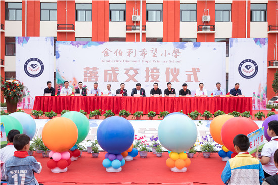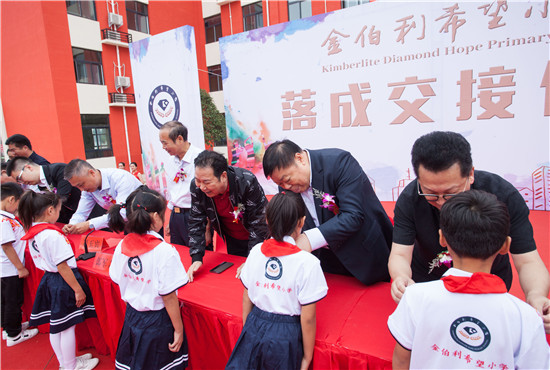 在落成交接典礼上,金伯利钻石集团总裁董搏先生作为捐赠方代表致辞:“去年我们在这里见证了金伯利希望小学的奠基和启航,如今我们可以看到孩子们脸上洋溢着幸福的笑容,让我们深知这一切都是值得的。”