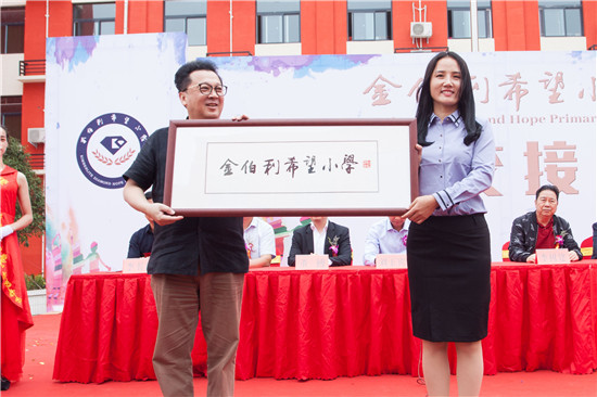 在落成仪式上,郁钧剑先生赠予校方“金伯利希望小学”题字牌匾,该题字也是郁钧剑先生亲笔题写,代表对希望小学师生们的美好祝福,希望越来越多的孩子们在这所学校里学习知识,改变命运。