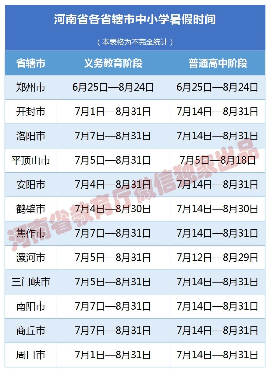 放假时间:义务教育阶段学校7月1日至8月31日;普通高中7月14日至8月31日。开学时间:义务教育阶段学校及普通高中均于9月1日(星期三)正式上课,教师8月28日上班。