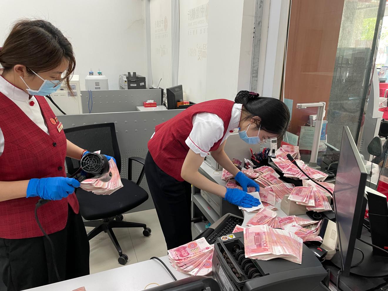 中信银行郑州未来路支行工作人员见状立即协调加派人手清点现金。为不影响其他客户办理业务,为该客户开通绿色通道,组织人手对泡水现金进行烘干清点。因浸泡时间过长,已出现发霉迹象,纸币不能直接清分,为了防止对人民币造成损坏,清点只能一张张小心翼翼地揭开,再用纸巾吸取纸币上明显的水渍,最后使用大功率吹风机吹干。为避免客户等待时间过长,工作人员牺牲吃午饭的时间,加班加点清点现金。在经过近6小时耐心细致的清点和烘干工作后,终于理清了客户二十多万元现金,并将其存入到客户账户。