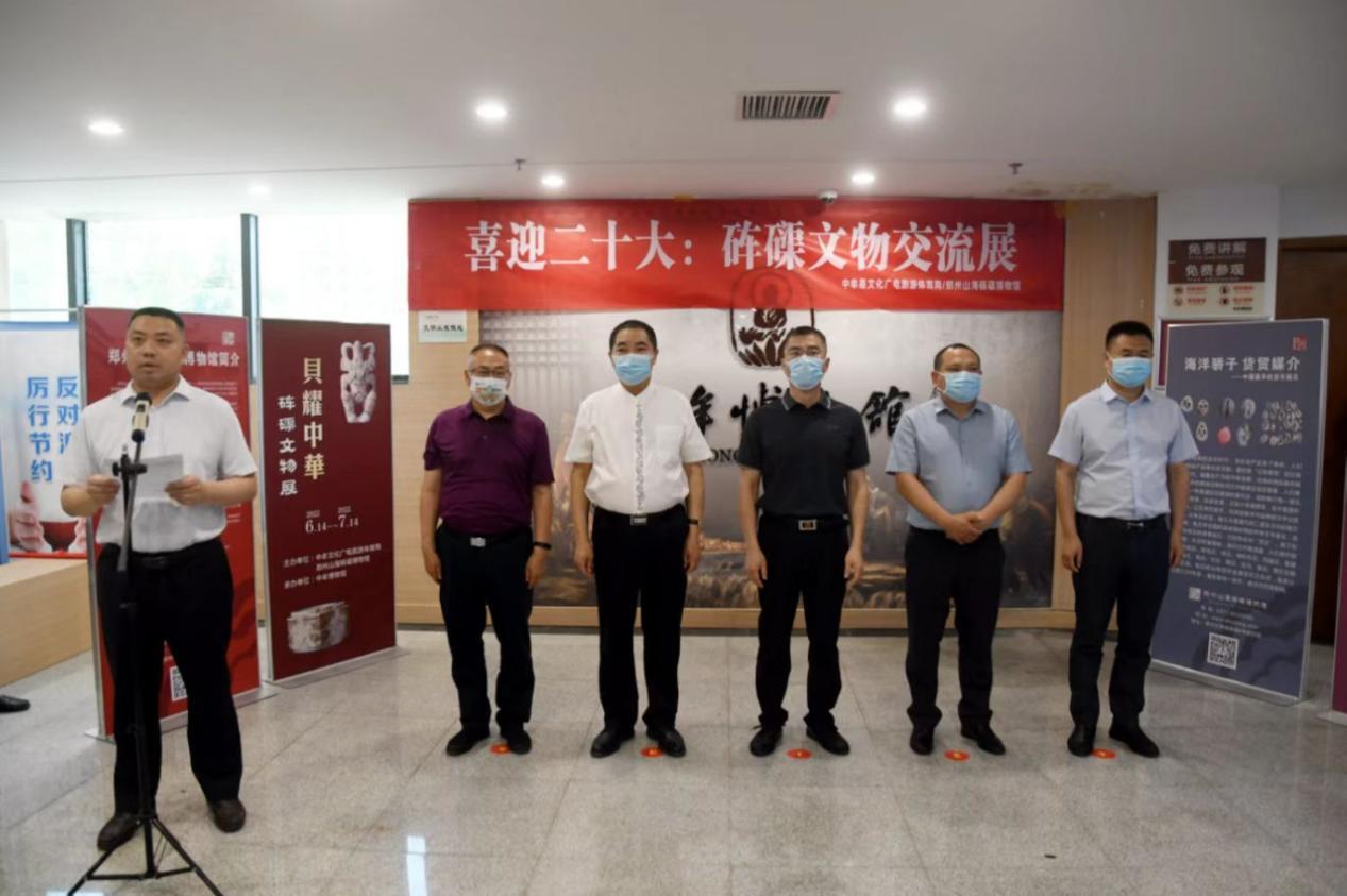中牟县文化广电旅游体育局联合郑州山海砗磲博物馆在中牟博物馆于6月14日开展“喜迎二十大:砗磲文物交流展”活动。郑州市文物局党组成员、副局长胡鹏,中牟县副县长李新建,郑州市文物局博物馆处处长李喜明,中牟县文化广电旅游体育局党组书记、局长王成立,郑州市山海砗磲博物馆馆长周云祥出席活动开幕仪式。
