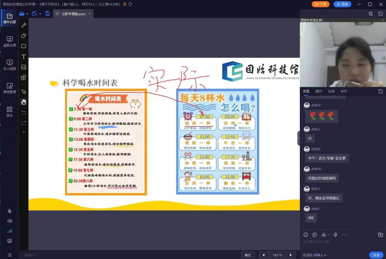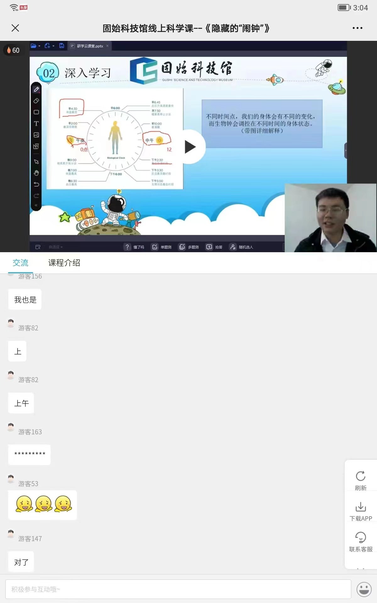 “云课堂”采用小班教学,由固始科技馆科普讲解员通过线上直播互动的方式,依托浙江万朋课后网平台,把科学常识与日常生活相结合,生动形象的讲解《生命的形状》《隐藏的“闹钟”》《人体的消化工厂》《离不开的水》等公益课