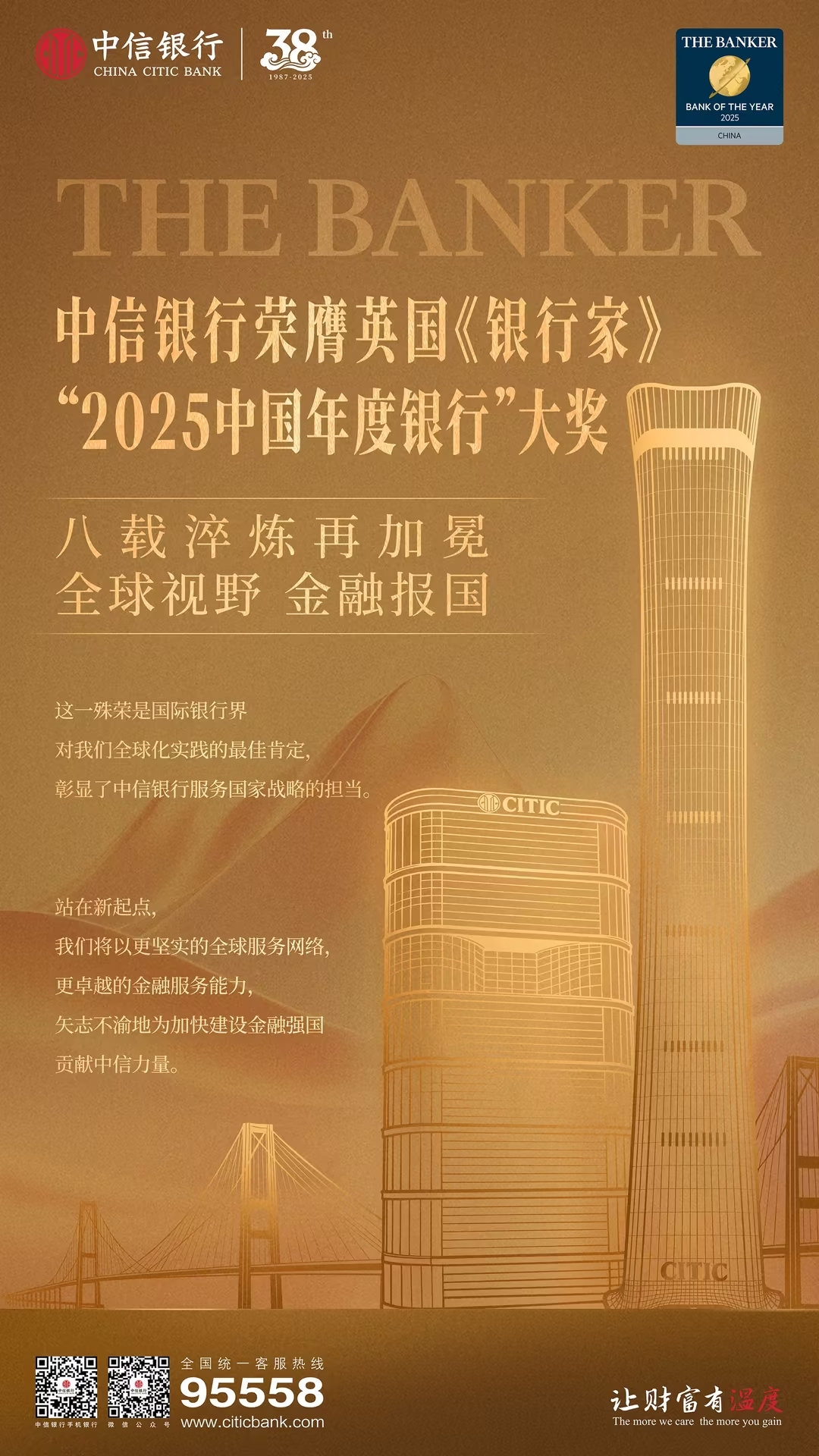 英国《银行家》杂志主办的“年度银行”评选是全球银行业最负盛名的奖项之一,以其独立、权威的评审体系著称,被誉为全球银行业的“奥斯卡”。此次是中信银行继2017年获奖后再度折桂,不仅标志着其在贯彻落实中央关于金融工作各项决策部署、扎实推进高质量发展方面取得突出成果,更展现了其在中国银行业商业化、国际化进程中的标杆地位。据Brand Finance揭晓的《2025年全球银行品牌价值榜》,中信银行的品牌价值为169.5亿美元,同比增幅27.2%,成为中国内地银行中品牌价值增幅第一的金融机构。