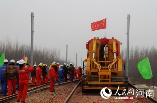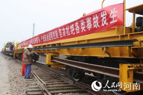 郑开城际铁路施工现场,建设、设计、监理、施工等多家单位共同见证500米长轨开铺过程。
