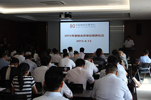 即将开业中原股权交易中心又有新进展,经过严格筛选,中原股权交易中心确定首批会员单位。2015年8月13日下午,中原股权交易中心召开首批会员授予仪式暨业务座谈会在路演大厅举行。仪式由中原股权交易中心总裁助理朱海涛主持。