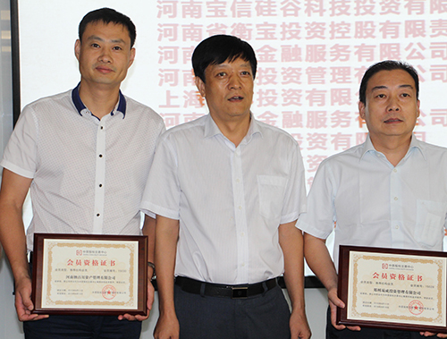在仪式上,中原股权交易中心董事长赵继增(中)为首批会员单位授予会员证书,共授予河南纳百川资产管理有限公司等11家推荐机构会员单位,以及律师事务所、会计事务所等18家服务机构会员单位。