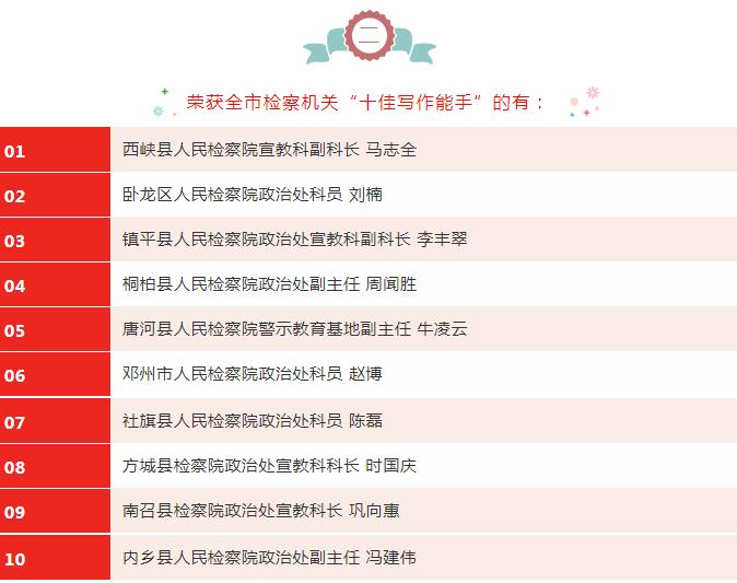 近日,经过各基层检察院层层推荐、组织审核、专业评议等程序,2018年度南阳市检察机关“十佳好新闻”“十佳写作能手”荣誉出炉。