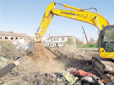该项目斜对面为一无名绿化工地,在施工过程中同样存在钩机违规土方作业,多点位黄土裸露约500平方米,特别是一处露天拌灰,石灰粉随风飘荡。