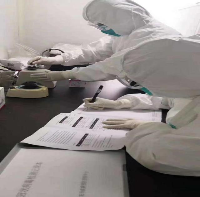 由于实验室的特殊性和个人防护装具的密闭性,穿着厚厚的防护服,汗水滴在身上,干了又湿,湿了又干。从接受、处置检测样本,将最最危险的标本从离心机取出来,对其进行编号分配,从标本开盖、取样、震荡、离心、加样,每一个步骤都得倍加小心。长时间的工作负荷和缺氧、密闭的环境让她时常出现眩晕、恶心的症状。
