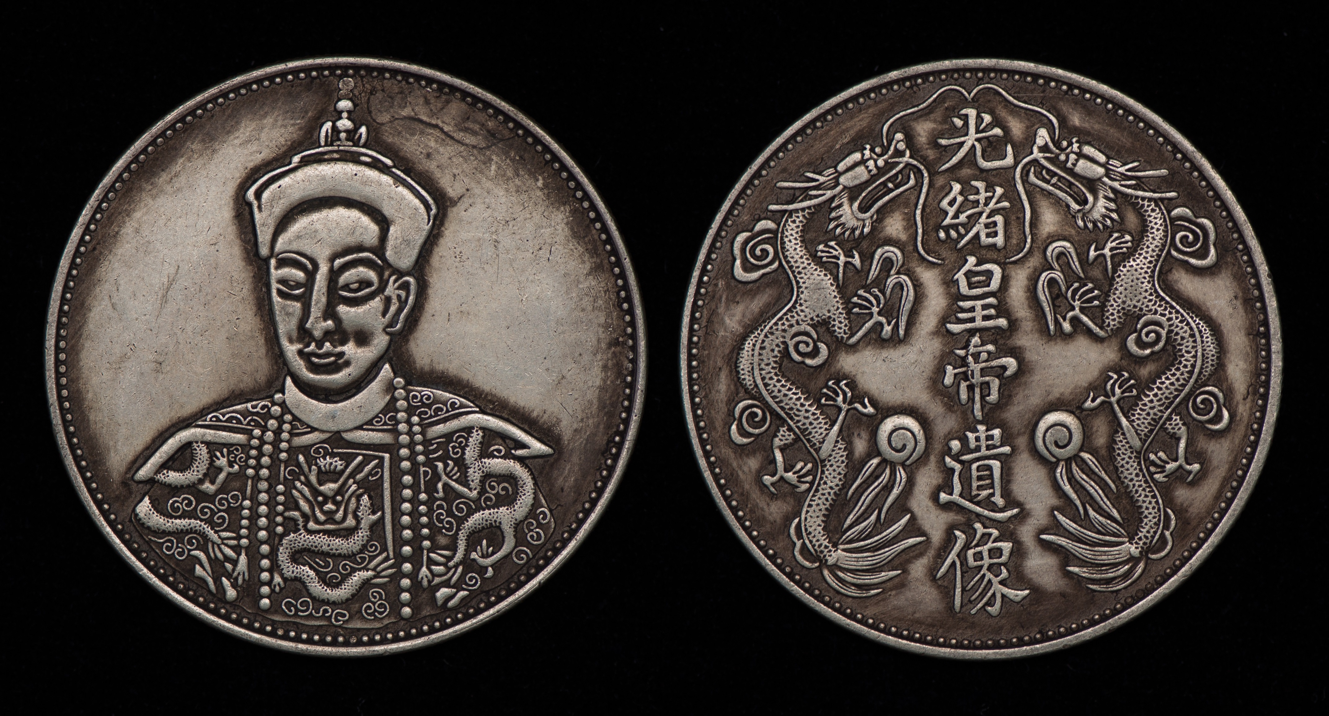 光绪皇帝遗像币正面为光绪皇帝的遗像,钱币背面为光绪皇帝遗像六字,两侧并有飞龙环绕;慈禧太后遗像币正面中镌慈禧太后半身正面像,上镌“大清国慈禧皇太后”、下镌“1861-1908”为慈禧太后出生及离世的年份。
