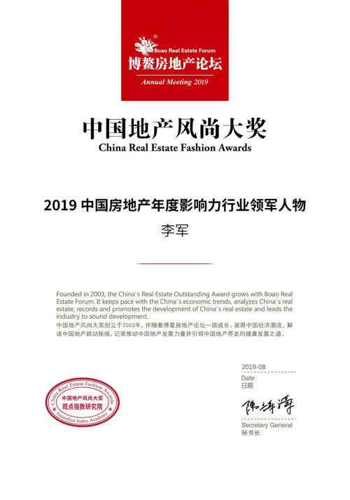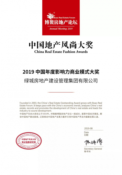 2019年8月7日晚,备受业界关注的第18届博鳌房地产论坛,隆重颁发“中国地产风尚大奖”。绿城管理集团喜获两项殊荣。公司蝉联“2019中国年度影响力商业模式大奖”及公司总经理李军被授予“2019中国房地产年度影响力行业领军。