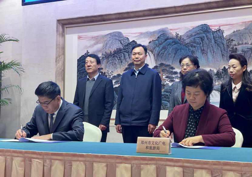 李芳、魏培仕共同签署《“郑开同城”文旅融合发展联合宣传推广协议》,焦健、左起超共同签署《郑州广播电视台和开封广播电视台相互开放媒体平台宣传文化旅游的合作协议》。