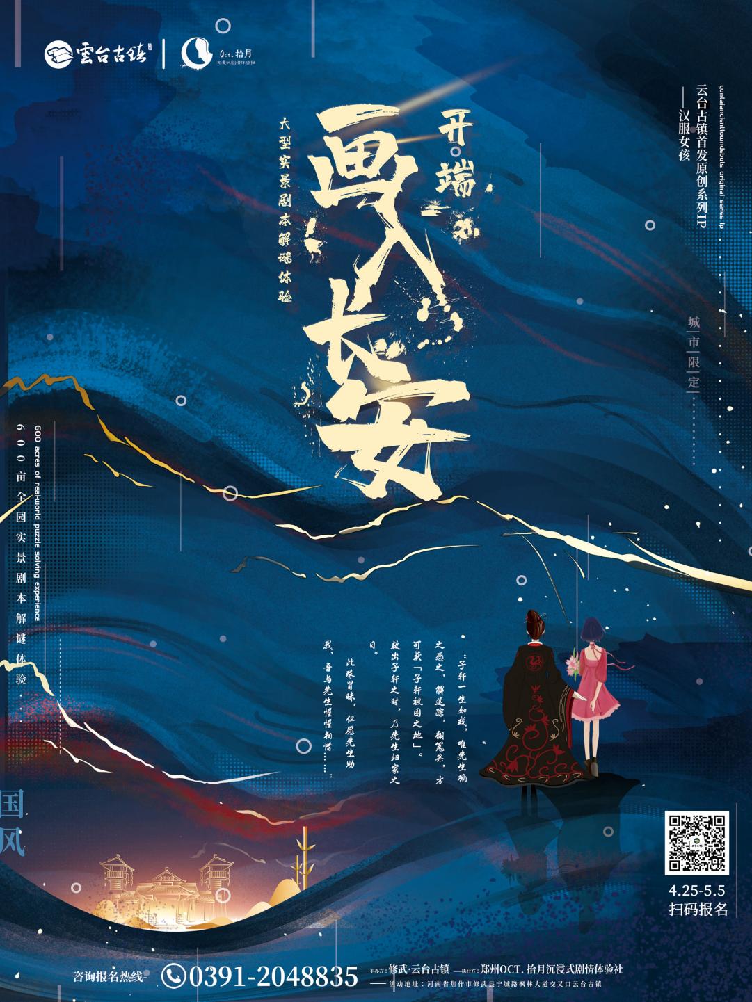 “画入长安——开端”剧本解谜,是云台古镇首发原创系列IP,以“汉服女孩”为主线的600亩全景剧本解谜体验,其间穿插贵妃巡游、府衙断案、鸿门盛宴等专场演艺,带给游客一场平行时空穿越之旅。