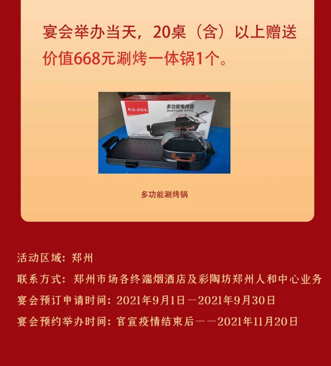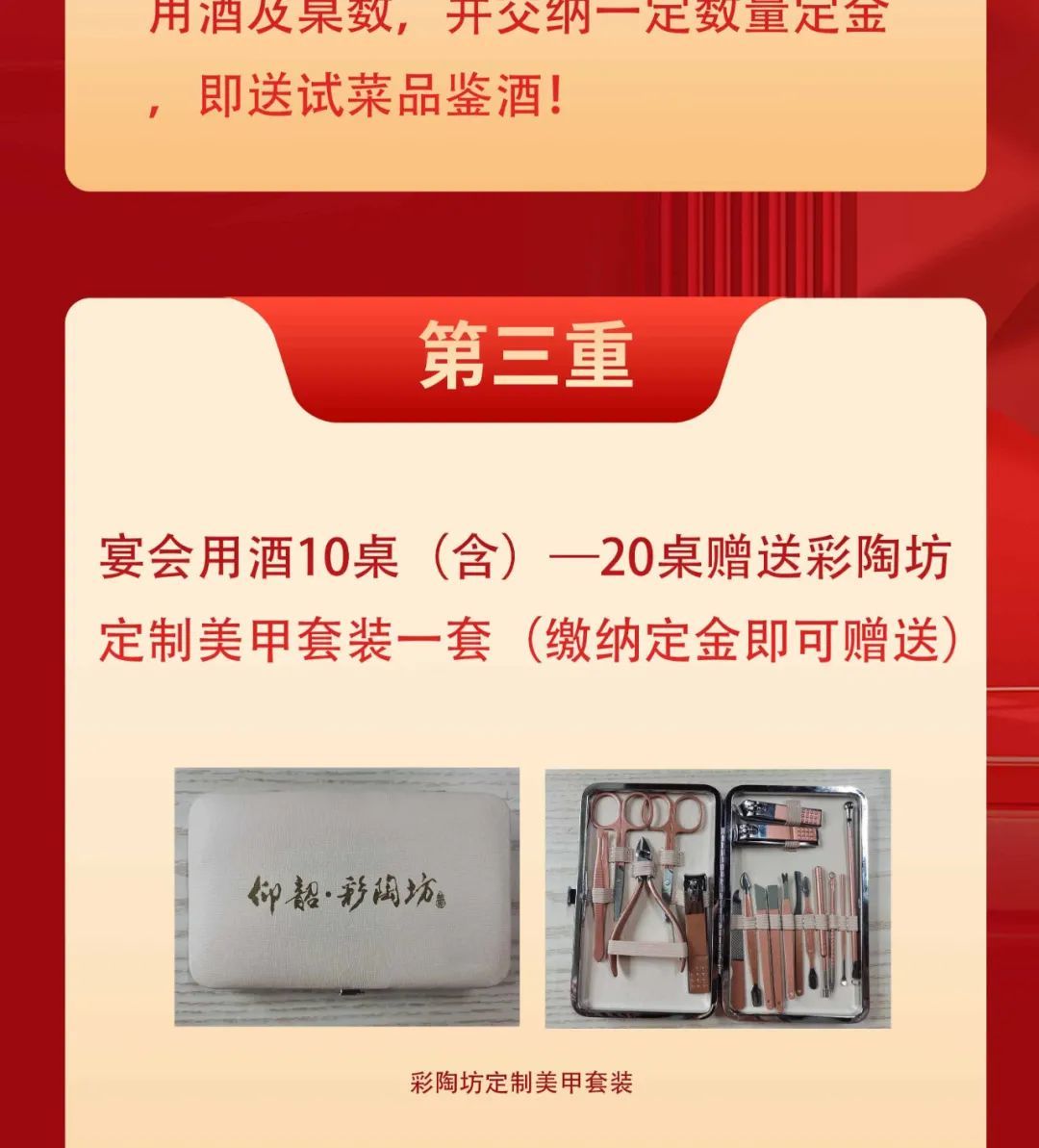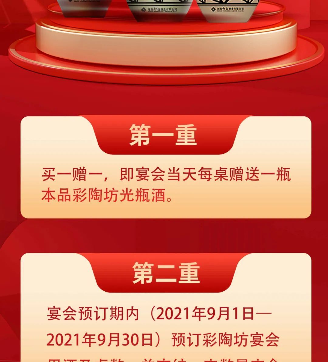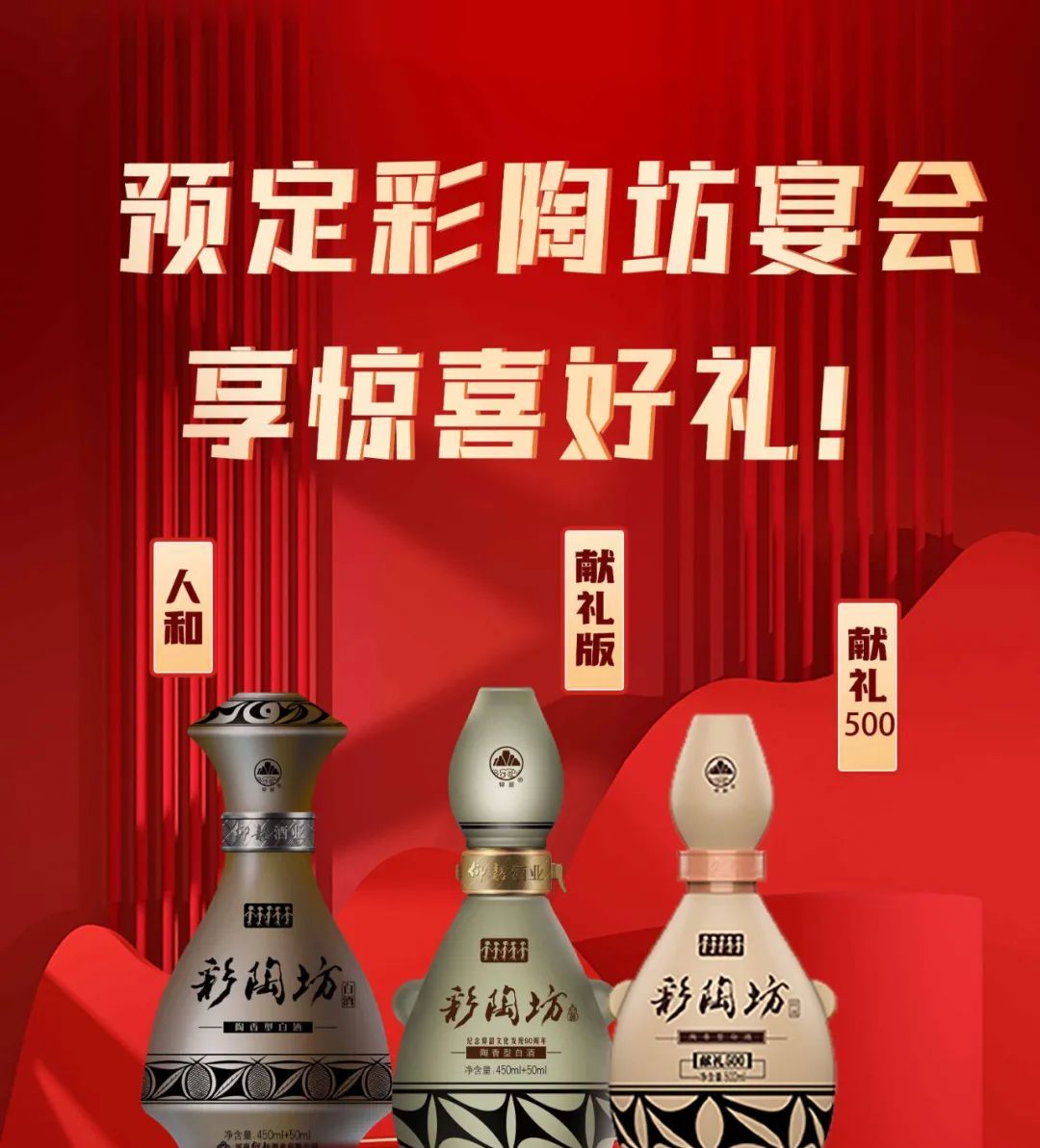 面对婚宴、生日宴、寿宴......宴会预定剧增的大好机会,彩陶坊人和郑州市场全面做好准备。想你所想的,仰韶彩陶坊人和、献礼版、献礼500产品已开通宴席政策,即日起,预定宴会选择彩陶坊产品,即有豪礼相送!
