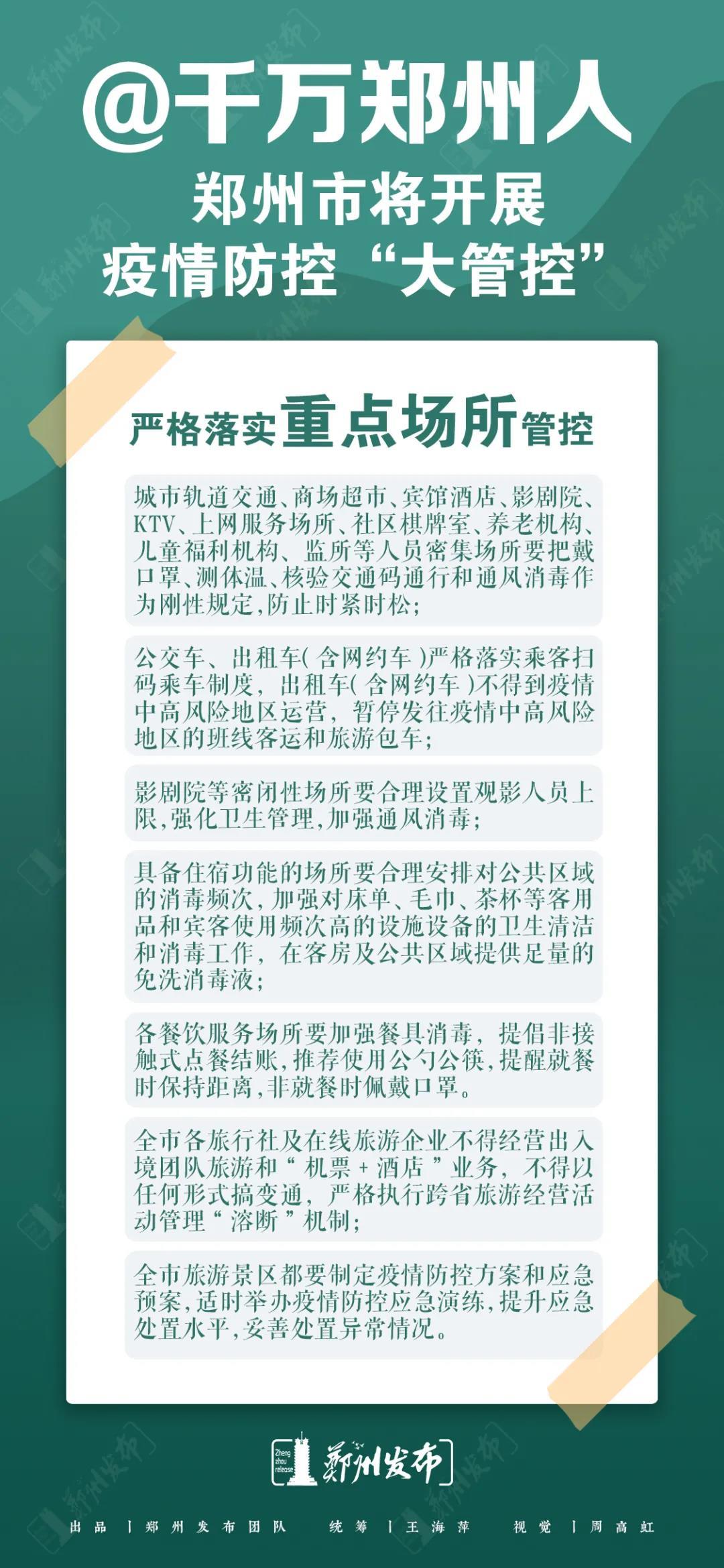 严格落实重点场所管控。 城市轨道交通、商场超市、宾馆酒店、影剧院、KTV、上网服务场所、社区棋牌室、养老机构、儿童福利机构、监所等人员密集场所要把戴口罩、测体温、核验交通码通行和通风消毒作为刚性规定,防止时紧时松。公交车、出租车(含网约车)严格落实乘客扫码乘车制度,出租车(含网约车)不得到疫情中高风险地区运营,暂停发往疫情中高风险地区的班线客运和旅游包车。影剧院等密闭性场所要合理设置观影人员上限,强化卫生管理,加强通风消毒。各餐饮服务场所要加强餐具消毒,提倡非接触式点餐结账,推荐使用公勺公筷,提醒就餐时保持距离,非就餐时佩戴口罩。全市各旅行社及在线旅游企业不得经营出入境团队旅游和“机票+酒店”业务,不得以任何形式搞变通。严格执行跨省旅游经营活动管理“熔断”机制。全市旅游景区都要制定疫情防控方案和应急预案,对省外来郑游客,要查验48小时内核酸检测阴性证明方可入内;严格落实游客健康码查验、检测体温、规范佩戴口罩等要求。