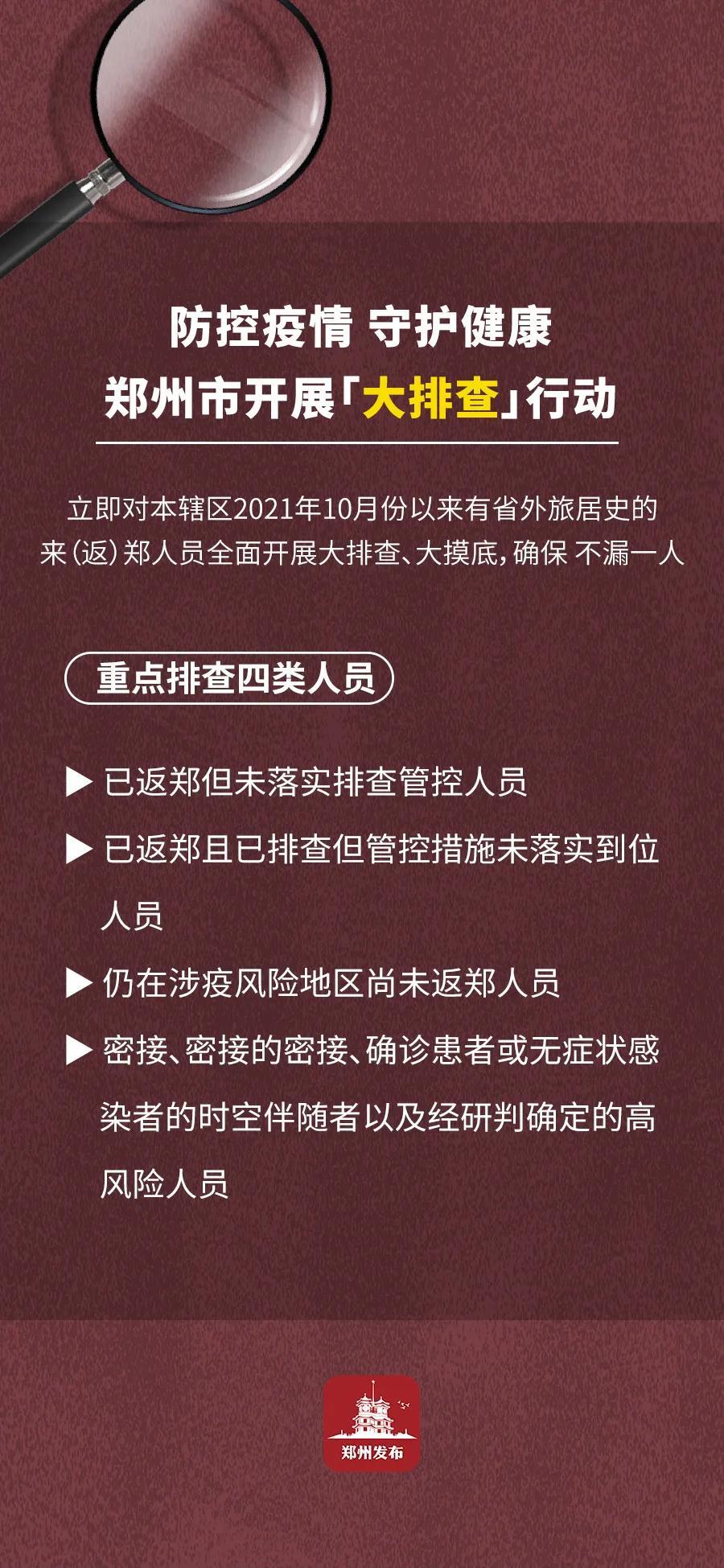 根据通知要求,按照属地管理原则,各开发区、区县(市)要立即对本辖区2021年10月份以来有省外旅居史的来(返)郑人员全面开展大排查、大摸底,确保不漏一人。