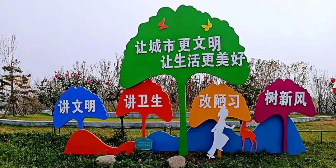交叉口四个方位角处设置的社会主义核心价值观和创建更高规格级文明城市的公益广告,设计新颖,造型独特,配色鲜颜,内容丰富,内涵深刻,闪靓美观,像一块块明晰的路标,将行人导向新时代文明和谐社会的美丽殿堂。