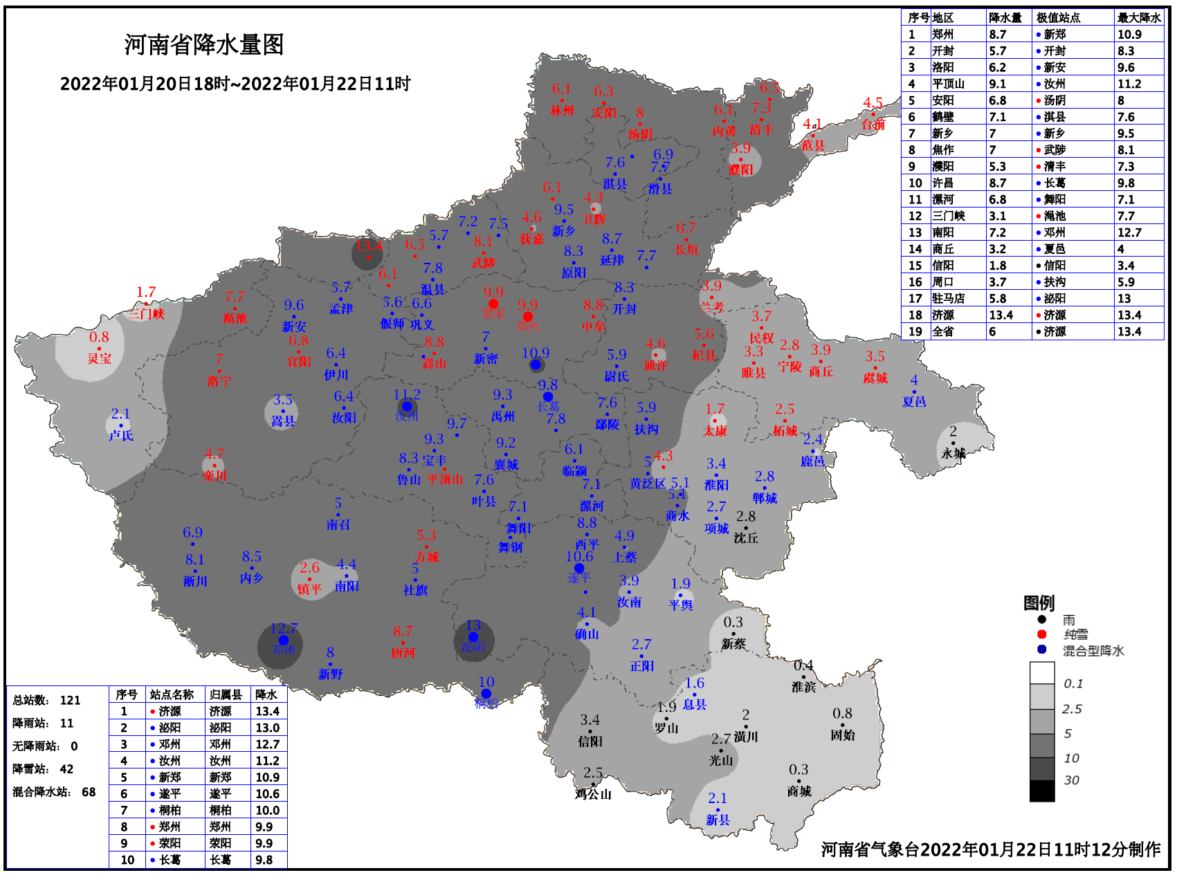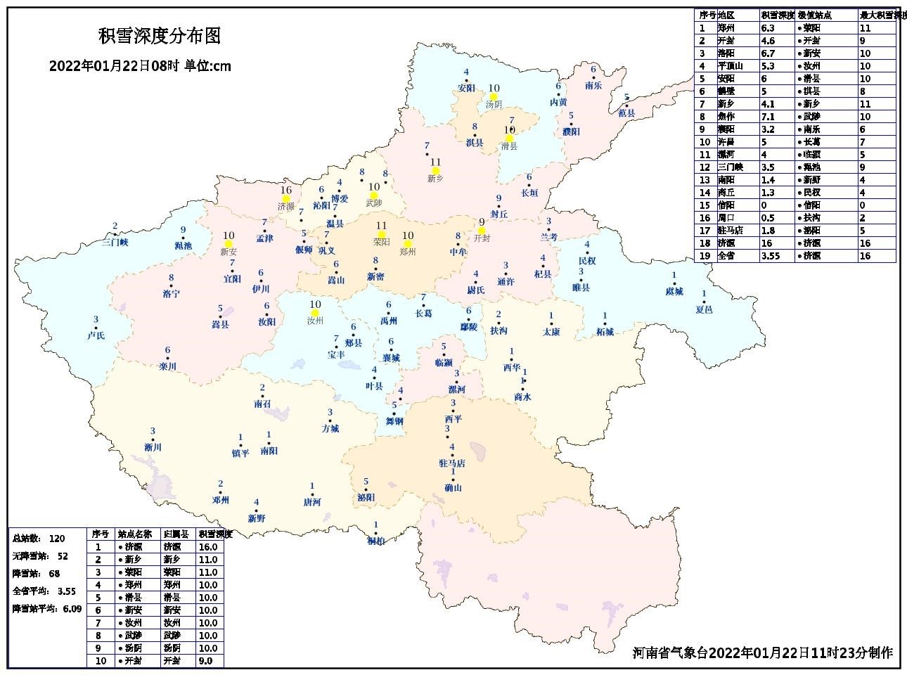 1月20日18时-22日11时,全省出现小到中雪或雨夹雪,中西部大部分地区大雪,局部暴雪;最大降雪量济源13.4毫米。郑州地区普降大雪,市区降雪量9.9毫米。截至今天08时,北中部大部分地区积雪深度在5~16厘米,济源最大为16厘米,郑州市区10厘米。