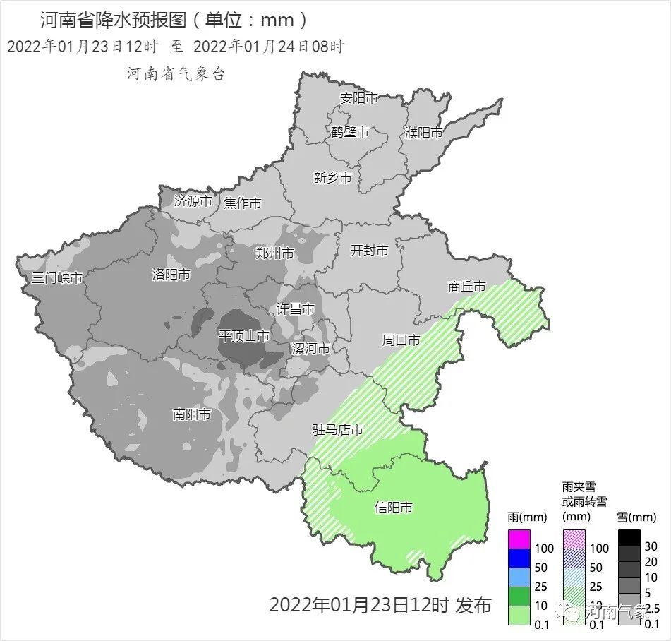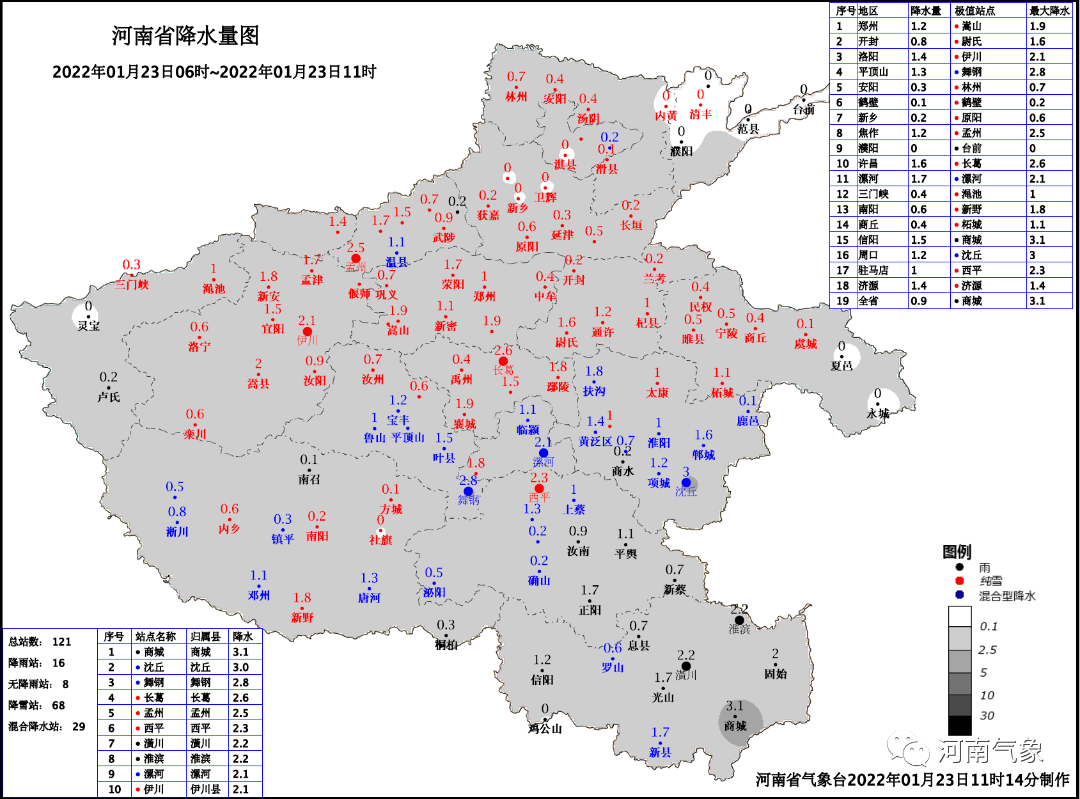 今天(23日)06时-11时,信阳地区出现小雨,其它大部地区出现小雪或雨夹雪,局部中雪。郑州地区有小雪,市区降雪量1毫米。截至今天08时,淮河以北大部分地区积雪深度在1~16厘米,其中济源、洛阳、郑州三地市和平顶山、开封两地区西北部及三门峡东部积雪深度达10厘米以上,最大济源16厘米,郑州市12厘米。