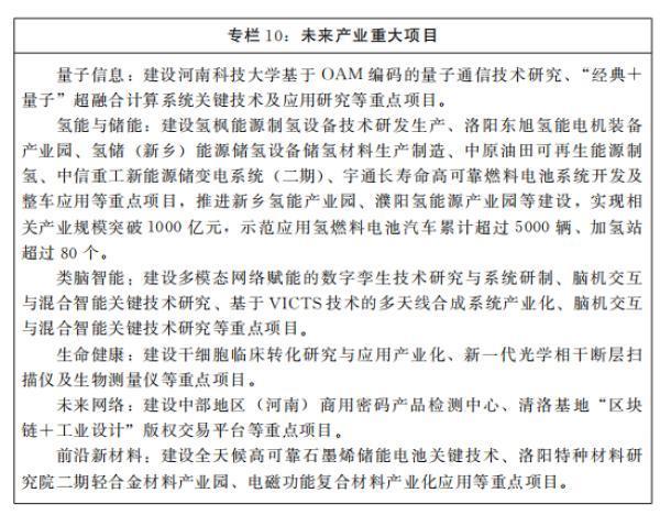 谋篇布局未来产业《规划》提出,河南要强化前沿领域跟踪突破,谋篇布局未来产业。围绕“优中培精”、“有中育新”、“无中生有”三大路径,超前谋划支撑未来产业发展的核心要素,谋篇布局量子信息、氢能与储能、类脑智能、未来网络等未来产业,力争在若干前沿领域实现重大突破,培育形成一批引领能力强、经济效益好、具备核心竞争力的未来产业链群,争创国家未来产业先导试验区。