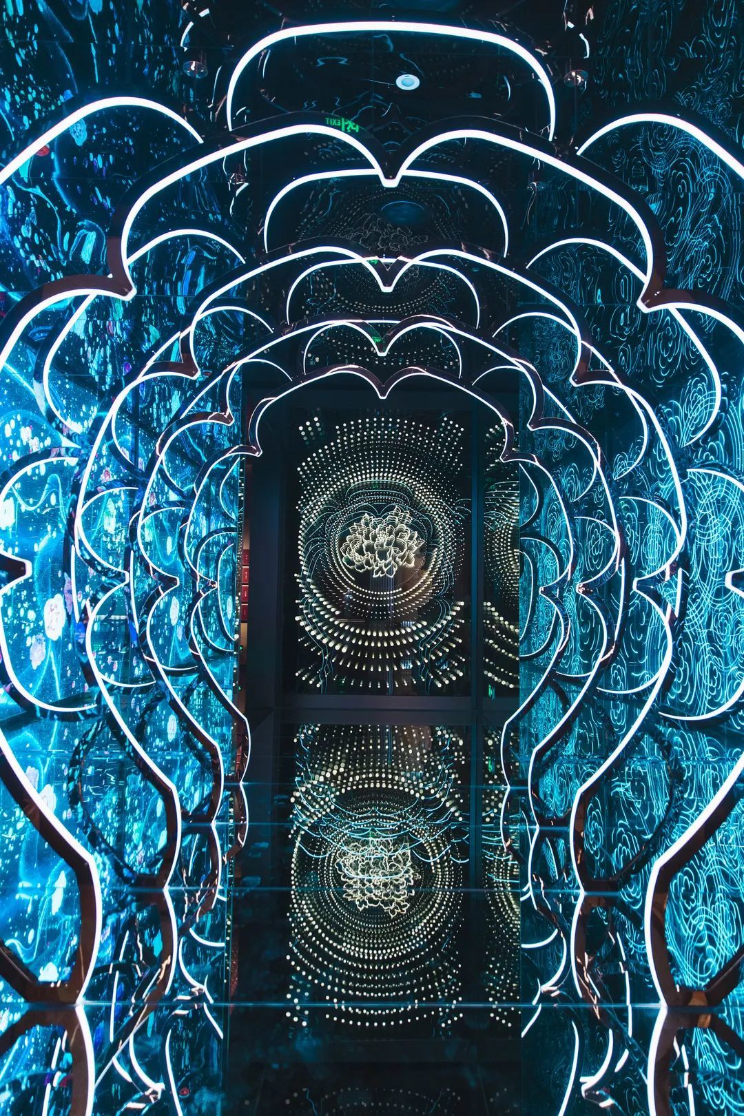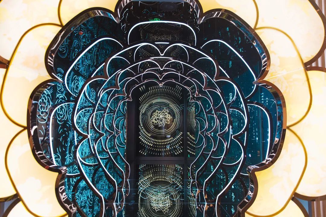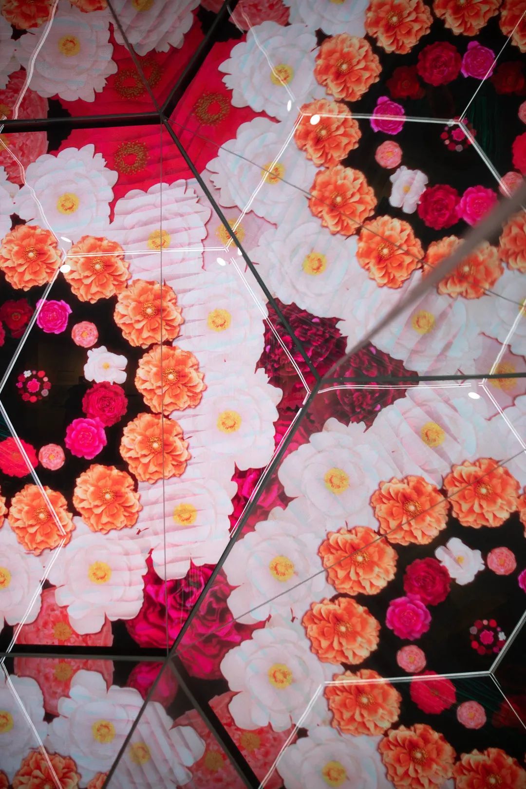 鲜艳花朵图案,万花筒般的过道连同镜面装置一起,营造出童话般的迷幻世界。