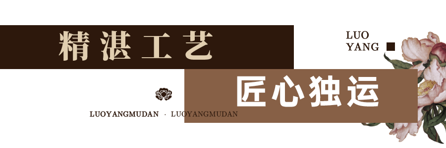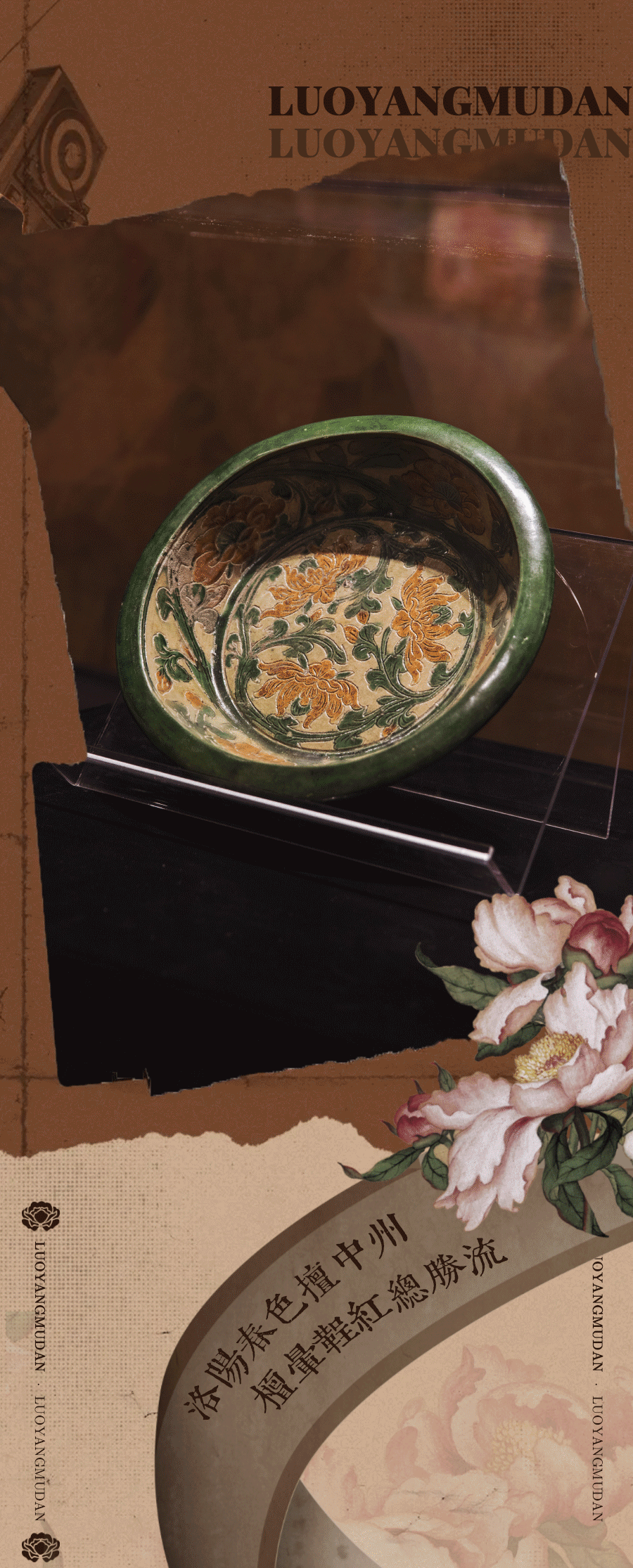 在色彩丰富的琉璃中,九朵造型各异的描金牡丹竞相开放。 雍容华贵的牡丹与玲珑剔透的琉璃交相呼应 ,寓意河洛文明源远流长。