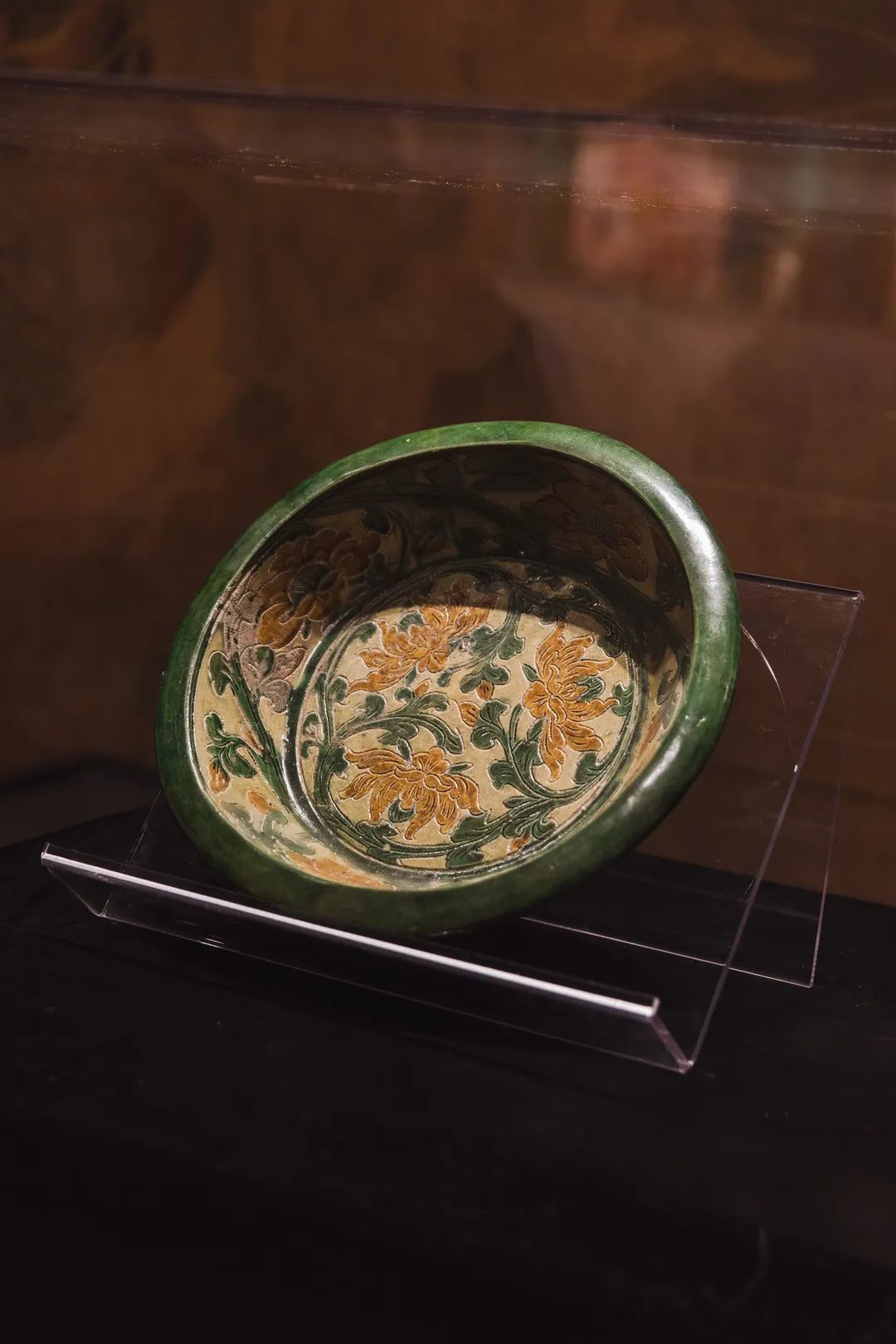在金代的三彩牡丹纹大盘对面,是由现代三彩艺术大师郭爱和打造的三彩牡丹壁画, 古今辉映,精彩的文化碰撞带你一秒“穿越”。