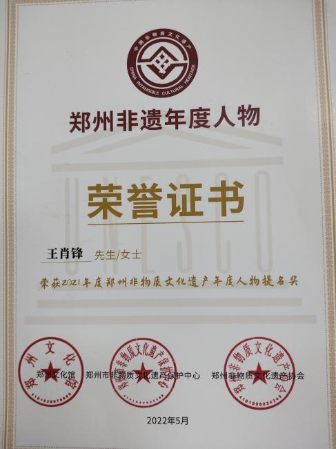 日前,随着2021郑州非遗年度人物颁奖仪式圆满结束,由郑州市文化广电和旅游局指导,郑州文化馆(郑州市非物质文化遗产保护中心)、郑州非物质文化遗产协会主办的2021“郑州非遗年度人物”推选宣传活动也落下帷幕,有20名代表性传承人被评为年度人物奖和提名奖。中牟县省级代表性传承人王肖锋在数百名推选人中脱颖而出榜上有名荣获2021郑州非遗年度人物提名奖。