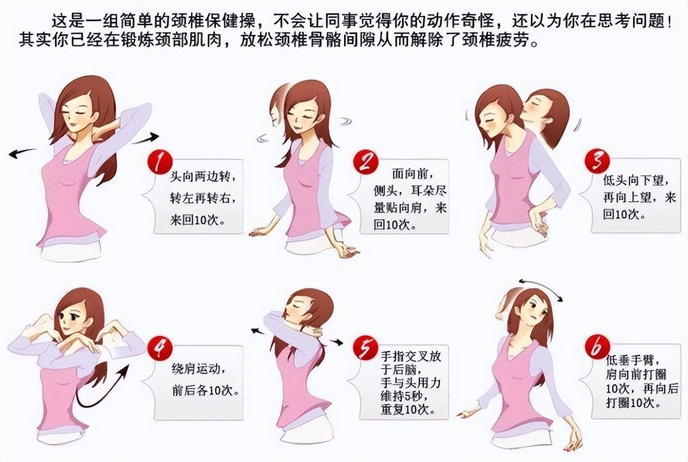 6.多做些活动颈椎的动作,长期低头伏案工作使颈椎处于同一个姿势很容易疲劳,患颈椎病的几率也会增加,所以要定期的让颈椎得到休息,进行些颈肩部肌肉的锻炼。