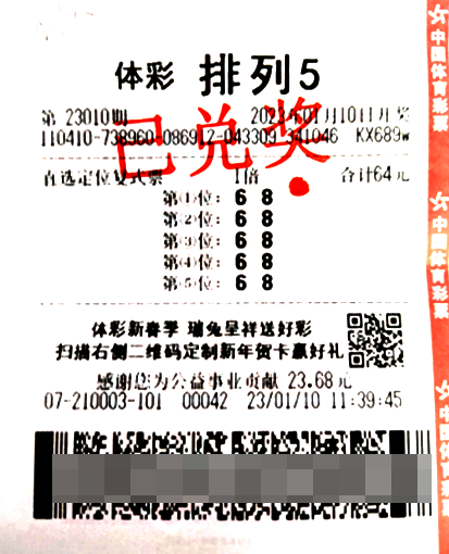 2023年1月11日上午,河南体彩新乡分中心来了一位幸运购彩者刘先生(化姓),他于1月10日购买的体彩排列5彩票中得23010期一等奖,奖金10万元。