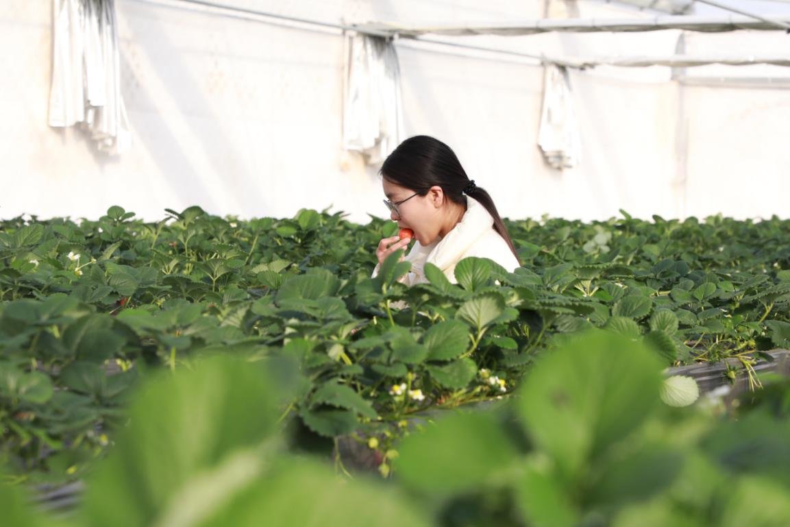 走进大棚,一股清甜的草莓香扑面而来。一垄垄翠绿的秧苗间,娇艳欲滴的草莓色泽诱人,犹如颗颗红宝石缀满枝头。几名游客正在采摘成熟的草莓,欢声笑语不断。