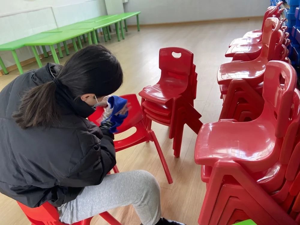各班老师对本班教室的活动室、卫生间、区域物品、桌椅等进行了清洗与消毒;对班级的物品摆放及地面门窗进行了整理和擦拭。孩子们的小毛巾、桌面玩具、小椅子等也全部进行了清洗晾晒,争取做到不留死角、不留盲区!