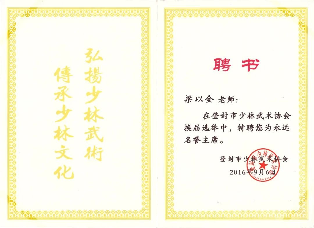 他是中华人民共和国成立后,登封第一位走出国门的少林武术传播者、第一所专业少林武术学校创办者、第一本少林武术教材编著者、少林派第一位中国武术九段者、少林派第一位国家高级武术教练、少林派第一位享受国务院政府特殊津贴者,少林派唯一中国当代十大武术名师、少林派唯一全国离退休老干部先进个人、少林派唯一国家武术研究院专家委员会专家;为河南省首批民间文化杰出传承人、河南武术改革开放四十年杰出贡献人物、新中国建设功勋人物、中华武林百杰、 共和国功勋名人杰出贡献人物、改革开放30年中国武术最具影响力人物、中华人民共和国成立70周年纪念章获得者,荣获《世界名人》证书,是德高望重的一代少林武术宗师。2016年,当选为登封市少林武术协会永远荣誉主席。