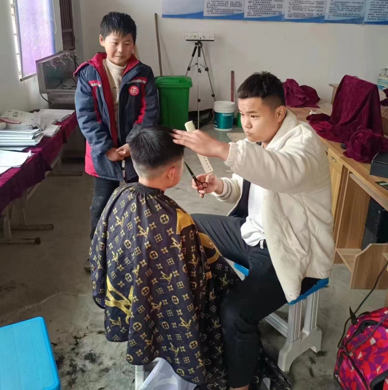 看着变换的新发型,孩子们也都在奶奶或在妈妈的微信朋友圈晒起了自己的新发型,同时也表达了对义务理发师和学校的感谢。