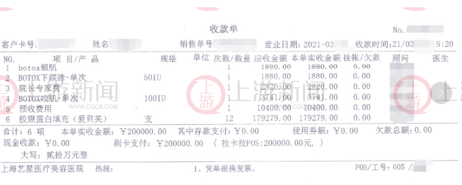 杨女士出示其在上海艺星医疗美容医院的病历和收款记录显示,2019年10月23日至2022年7月31日,杨女士在上海艺星医疗美容医院近3年接受了18次注射美容手术,注射美容针剂近92支,最多一次注射了某品牌美容针剂7毫升。24张缴费记录显示,在时间上每两月就有一笔缴费记录,其中最高一笔是30.2万元。杨女士告诉记者:“在销售人员的劝说下,我一次就在上海艺星充值了20万元,大多用于打某品牌。”