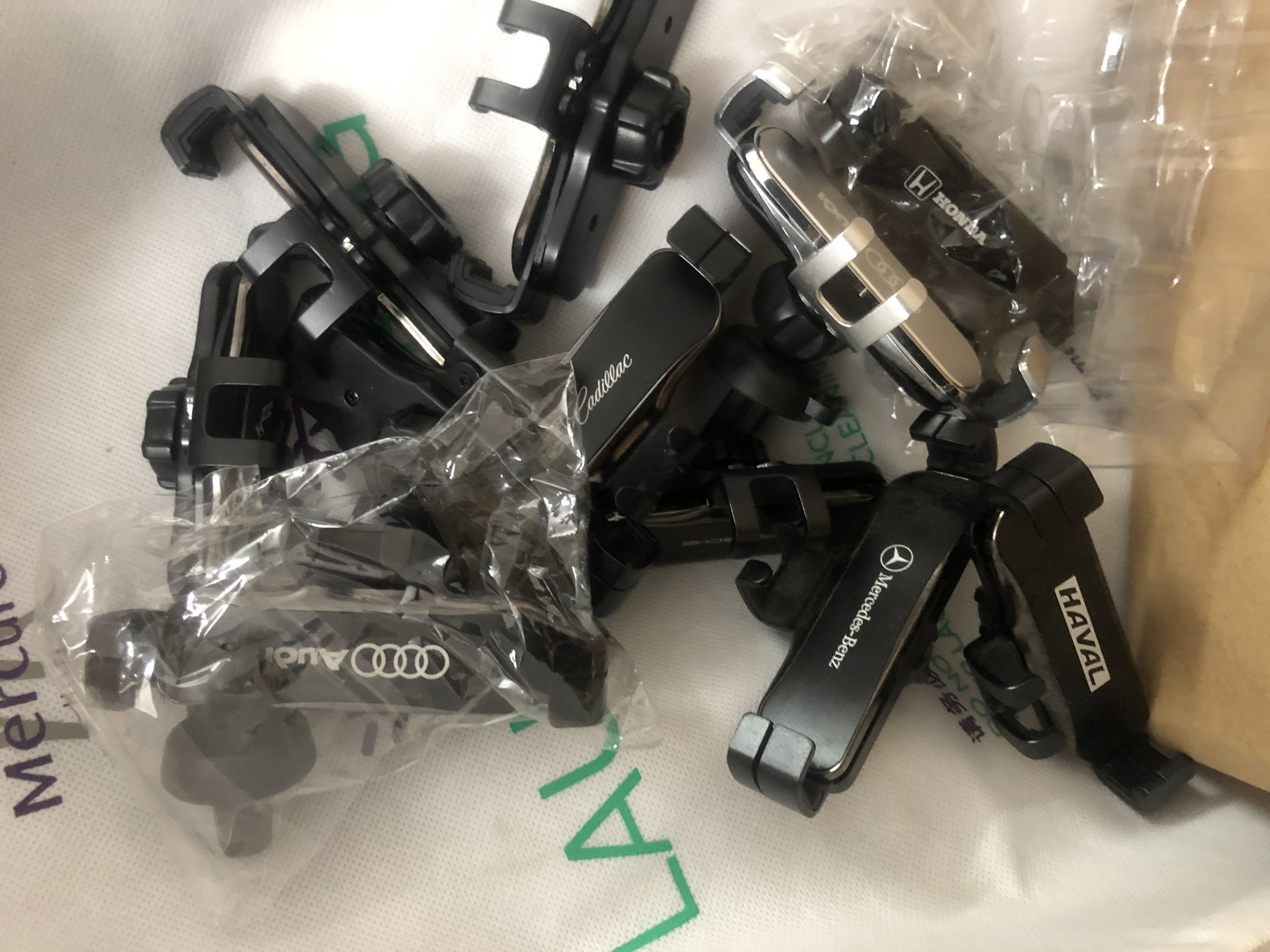自建房的二楼是一处仓库,堆放着各种汽车内饰小配件,部分配件已打上宝马、奔驰、奥迪、雷克萨斯、沃尔沃、大众、福特等汽车品牌的车标。其中,以市面上最常见的一二线豪车品牌的车标为多。