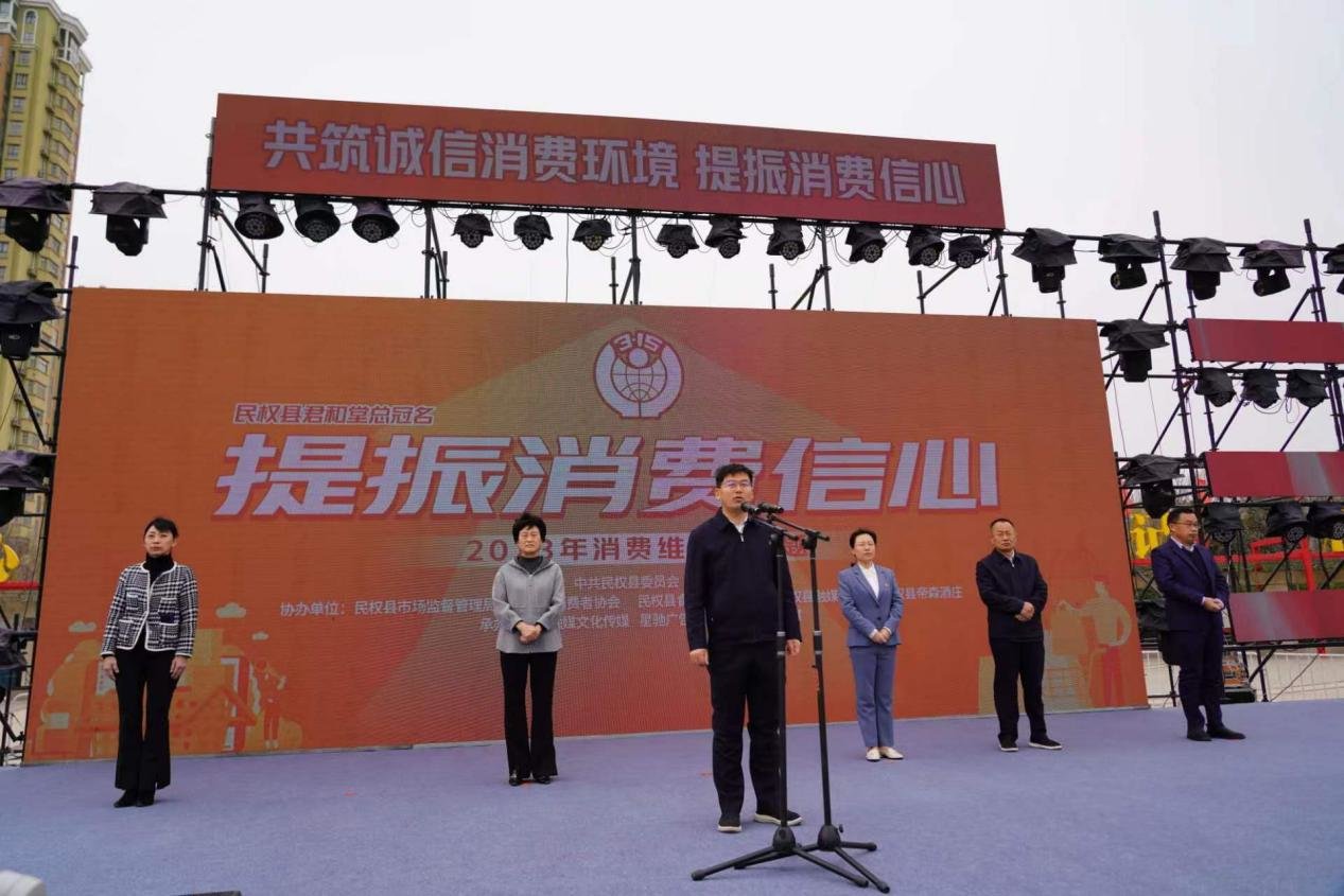 3月15日上午,民权县在东区民生广场开展2023年“3·15”国际消费者权益日宣传活动。商丘市人大常委会副主任、民权县委书记张团结,县委副书记、县长王静娴,县人大主任周燕,县政协主席周明河,县委常委、宣传部长、副县长毕道喜,县委常委、副县长于茜,各乡镇(街道)和有关单位的负责同志,16个单位的干部职工方队代表,部分企业和个体工商户代表参加活动。