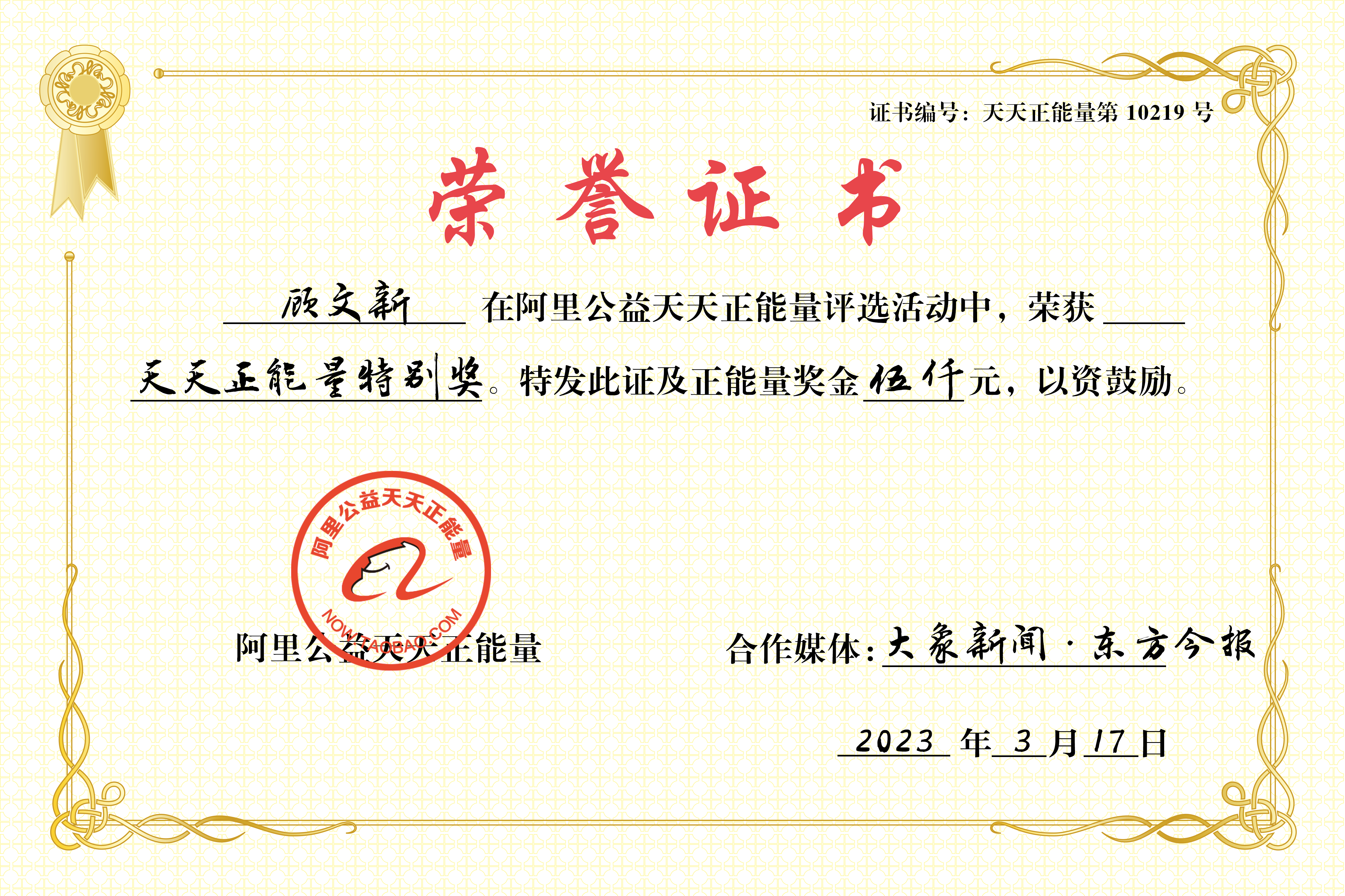 为褒扬71岁退休老师顾文新的下乡支教之举,阿里公益天天正能量联合大象新闻·东方今报为顾文新颁发天天正能量特别奖及5000元奖励,谢谢她,用余热点亮乡村孩子的艺术之灯。