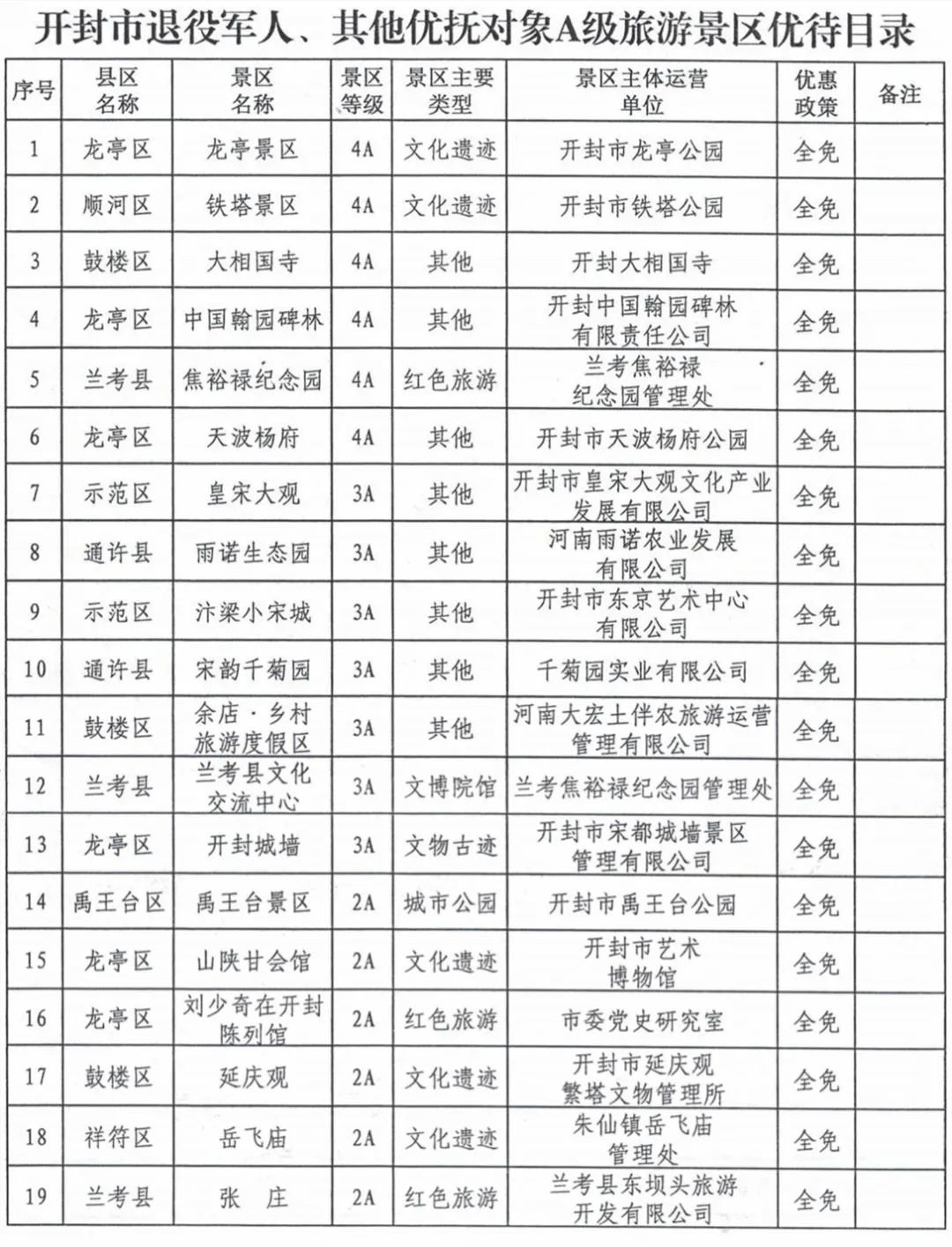 在开封市行政区域内,退役军人和其他优抚对象持河南省制发的《中华人民共和国退役军人优待证》《中华人民共和国烈士、因公牺牲军人、病故军人遗属优待证》和本人身份证到实行政府定价或指导价管理的A级旅游景区游览免收门票(园中园、景中景、夜游门票除外)。鼓励实行市场调节价的A级旅游景区对持优待证人员实行门票减免优待。具体优待目录由市文化广电和旅游局确认发布。