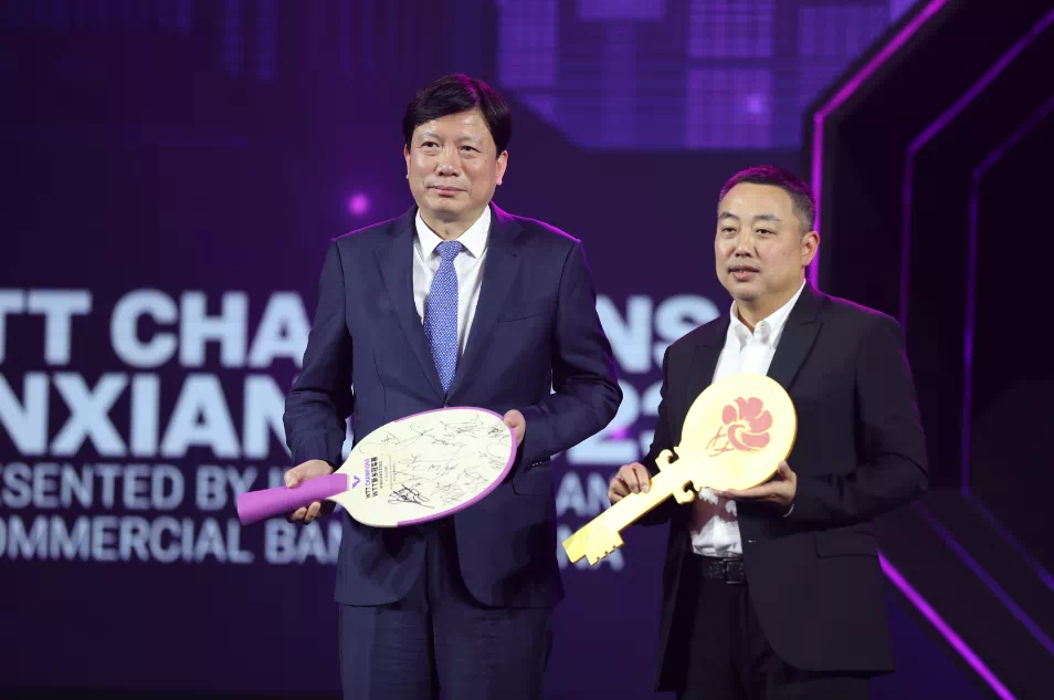 刘国梁、朱俊峰为男单冠军颁奖,李卫东、张琎为女单冠军颁奖,史蒂夫·丹顿、孙栋为男单亚军颁奖,马宇峰、余志伟为女单亚军颁奖。领奖台熠熠生辉,与全球共同见证和分享这份冠军殊荣。