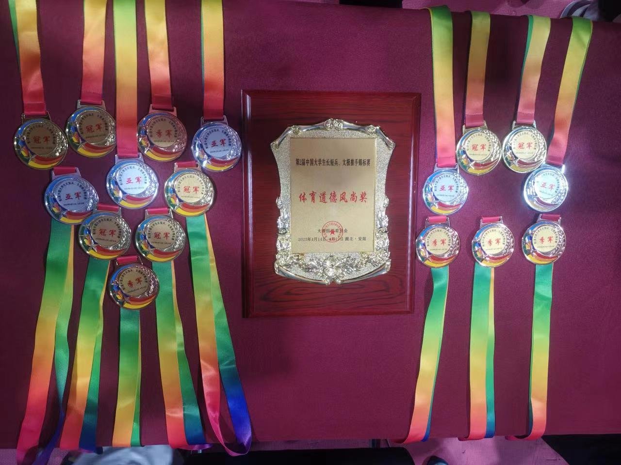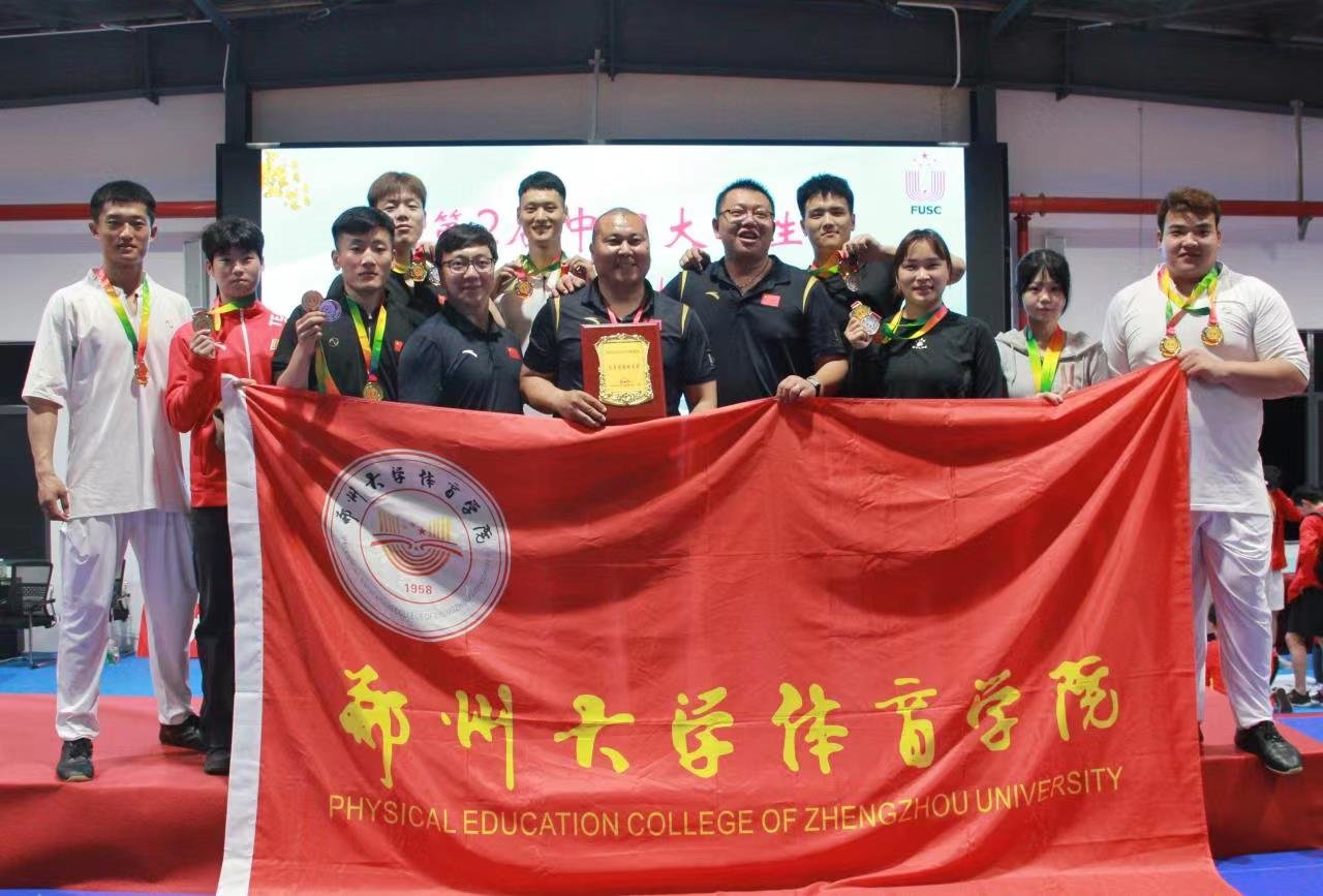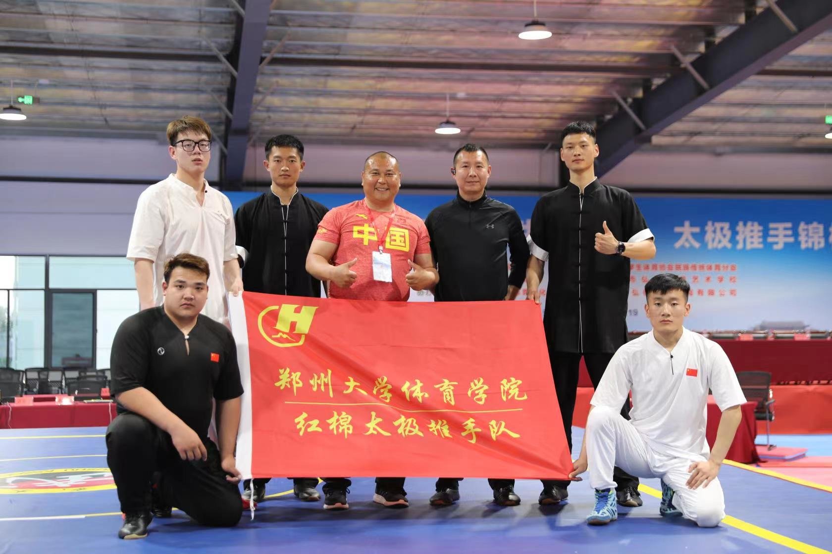 郑州大学体育学院代表队在领队武术系主任胡玉玺教授,教练员刘霓,陈钢、余省威、刘鑫宇老师,场外指导吴武斌,孙恒恒老师的带领下,九名学生参加了此次大赛,经过三天激烈战斗,共取得5块金牌,5块银牌,4块铜牌,其中,太极推手项目:李金钊获得男子丙B组推手实战75Kg公斤冠军,李昊获得男子丙B组推手实战85Kg公斤以上冠军,李金钊、李昊、翟佳明获得男子丙B组团体赛重量级冠军,翟佳明获得男子丙B组推手实战85Kg公斤级以上亚军,赵少波获得男子丙A组推手实战52Kg公斤级亚军,骆国强获得男子丙A组推手实战70Kg公斤级亚军,骆国强、赵少波获得男子丙A组活步推手(套路形式)季军,长短兵项目:郝然获得男子丙B组54公斤短兵冠军,贾乐仪获得女子丙B组 69公斤长兵冠军和短兵亚军,段浩森获得男子丙A组 84公斤短兵亚军和长兵季军,王思懿获得女子丙A组47公斤短兵季军和长兵季军,骆国强,郝然获得个人体育道德风尚奖,郑州大学体育学院获得体育道德风尚奖,教练员刘霓获得优秀教练员称号。