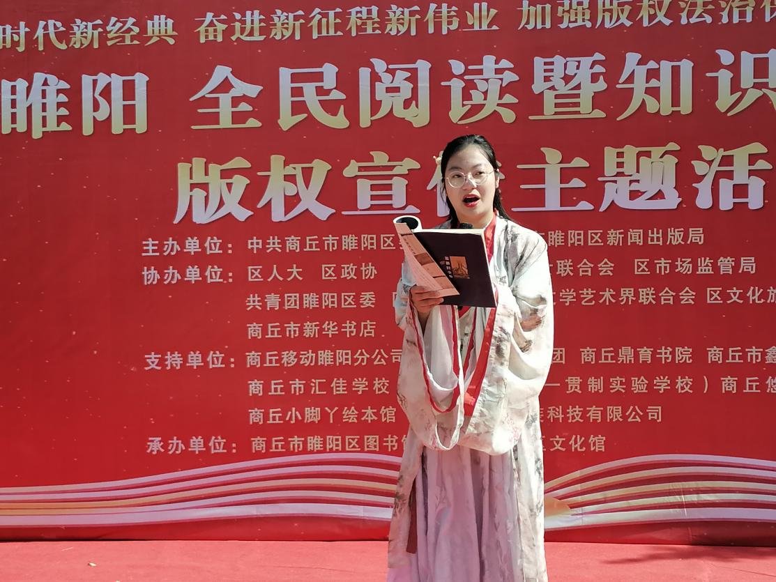 本次活动由睢阳区委宣传部以“阅读新时代新经典 、奋进新征程新伟业、加强知识产权法治保障、 有力支持全面创新”为主题进行主办。现场,设置了版权宣传展、书画展、非物质文化展等展出。 还举办了故事讲读、诗歌朗诵、绘本之旅、亲子共读等活动,并免费为少年儿童发放了儿童读物。