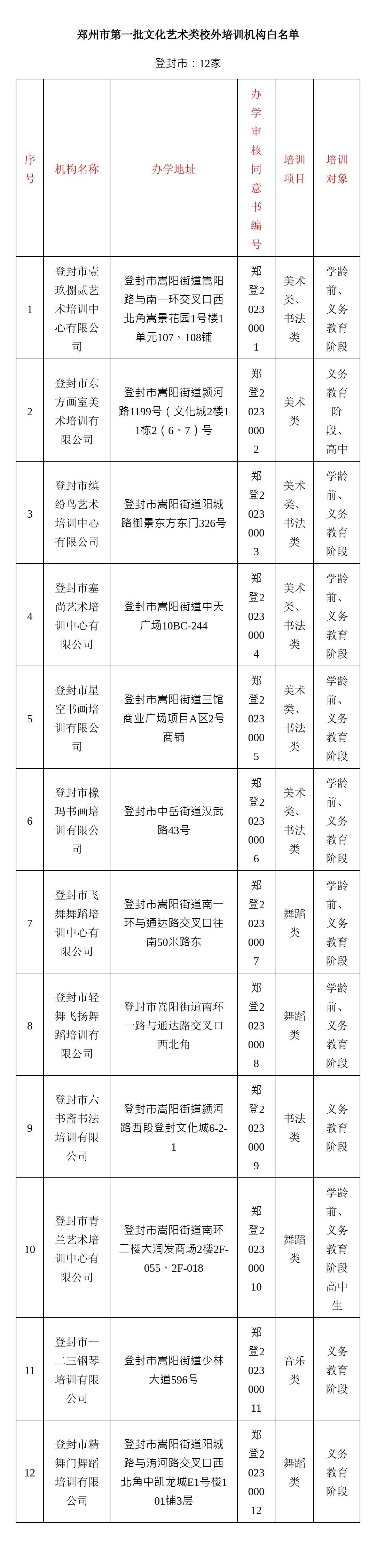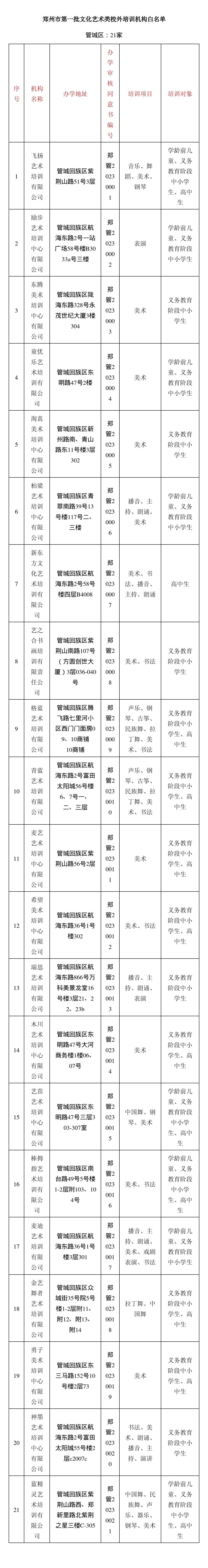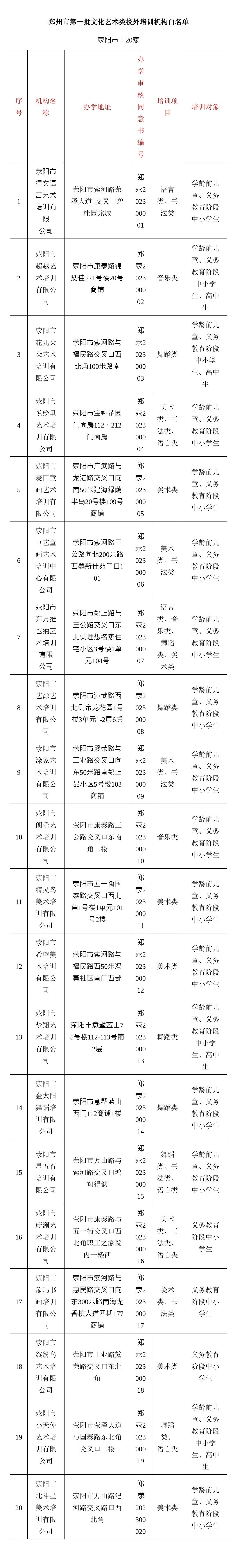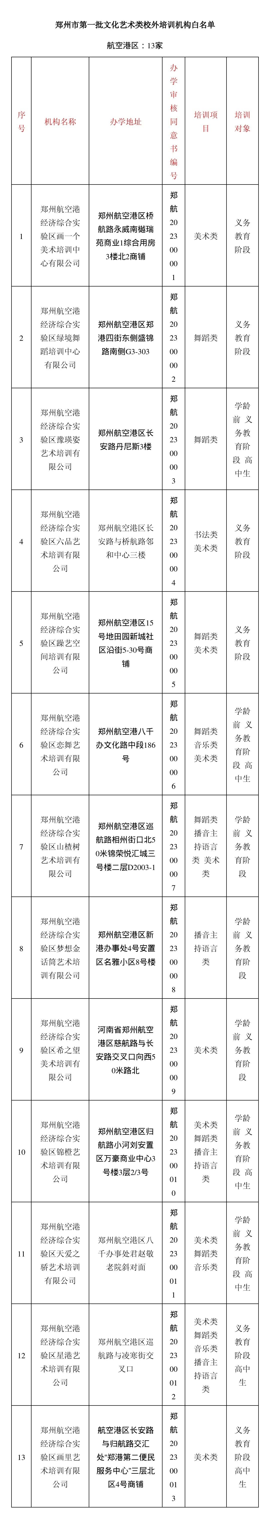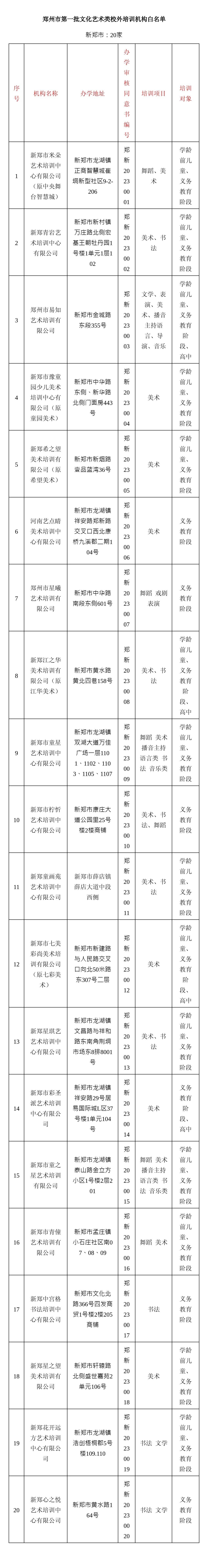 为严格落实国家“双减”政策,根据《河南省文化艺术类校外培训设置和管理指南(试行)》和《郑州市文化艺术类校外培训机构监督管理实施方案(试行)》的通知要求,经各开发区和区县(市)文化广电和旅游主管部门审核同意,截止2023年4月27日,第一批373家文化艺术类校外培训机构已取得文化艺术线下培训办学资质,现予以公布(见下方附表)。
