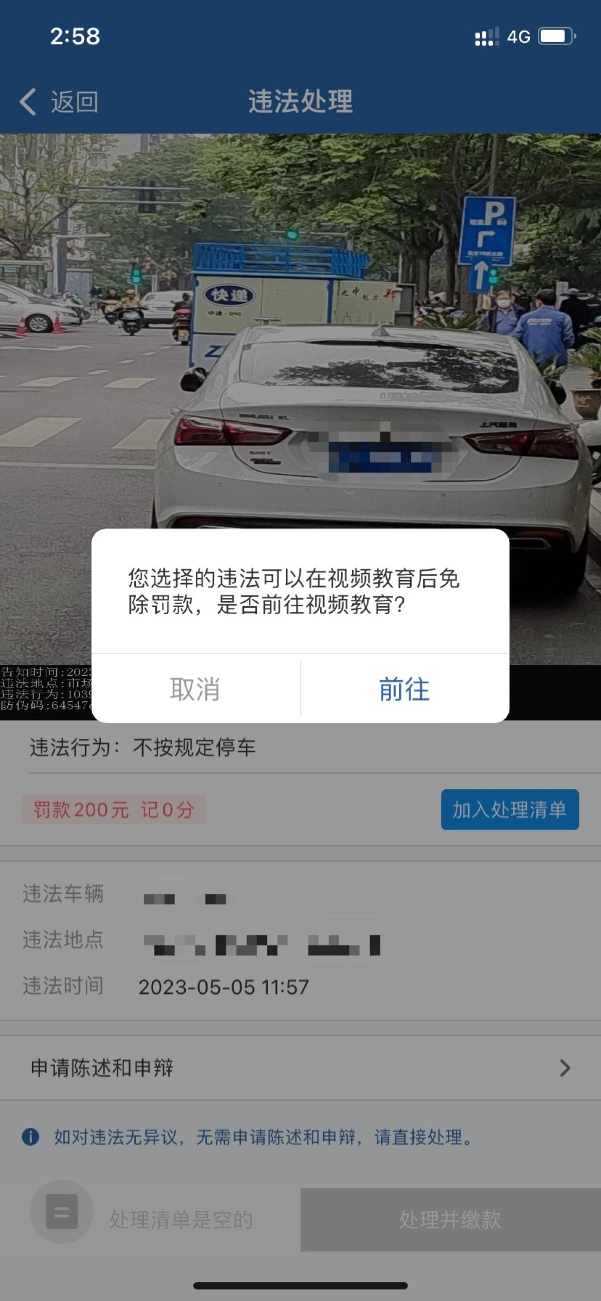 5月6日,王先生打开“交管12123”手机APP处理该违停,打开“违法处理”页面确认违法行为:“不按规定停车”。不过跟以前不同的是,页面弹出一个提示窗口:“您选择的违法可以在视频教育后免除罚款,是否前往视频教育?”