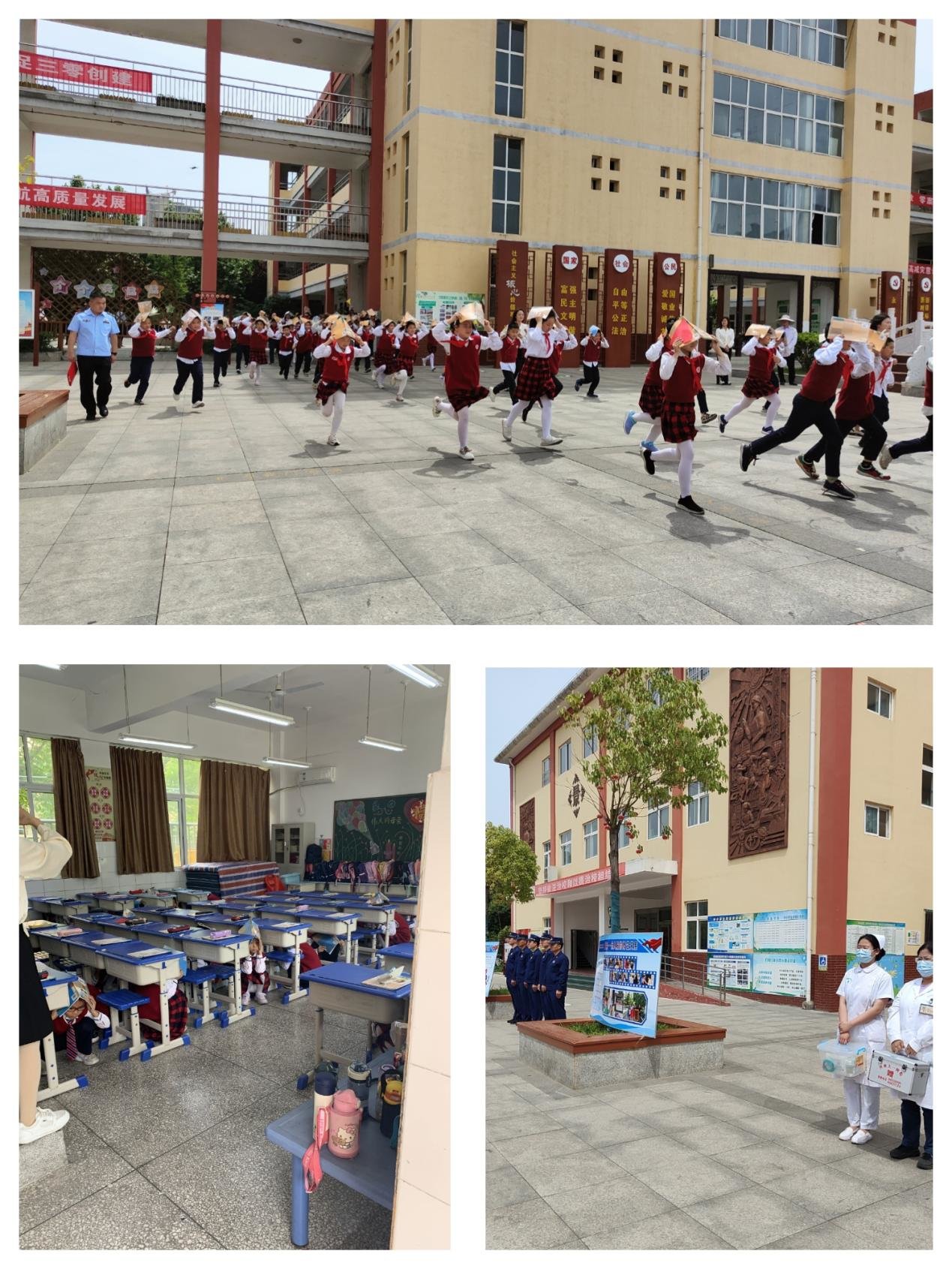 演练开始前,现场全体人员集体向2008年汶川大地震遇难人员默哀。上午10时30分,地震应急演练活动正式拉开帷幕,第一声“地震来临”警报响起,学校迅速发出“实施紧急避险”的指令!学生在教师的有序指挥下做到临危不乱,迅速利用各种就近物品保护身体重要部位,躲到相对安全的桌子下或坚固的墙、三角处等地方,躲避最强震波。随着第二声“紧急疏散”的警报响起,学生用书本保护头部,在疏散人员及老师的指引下,快速、安全、有序地撤离。到达安全地点后,各班老师立刻清点本班人数,确保全体师生安全撤离,无人员被困,并将撤离人数上报现场总指挥,仅用时85秒,全体师生1700余人全部撤离到安全地带。