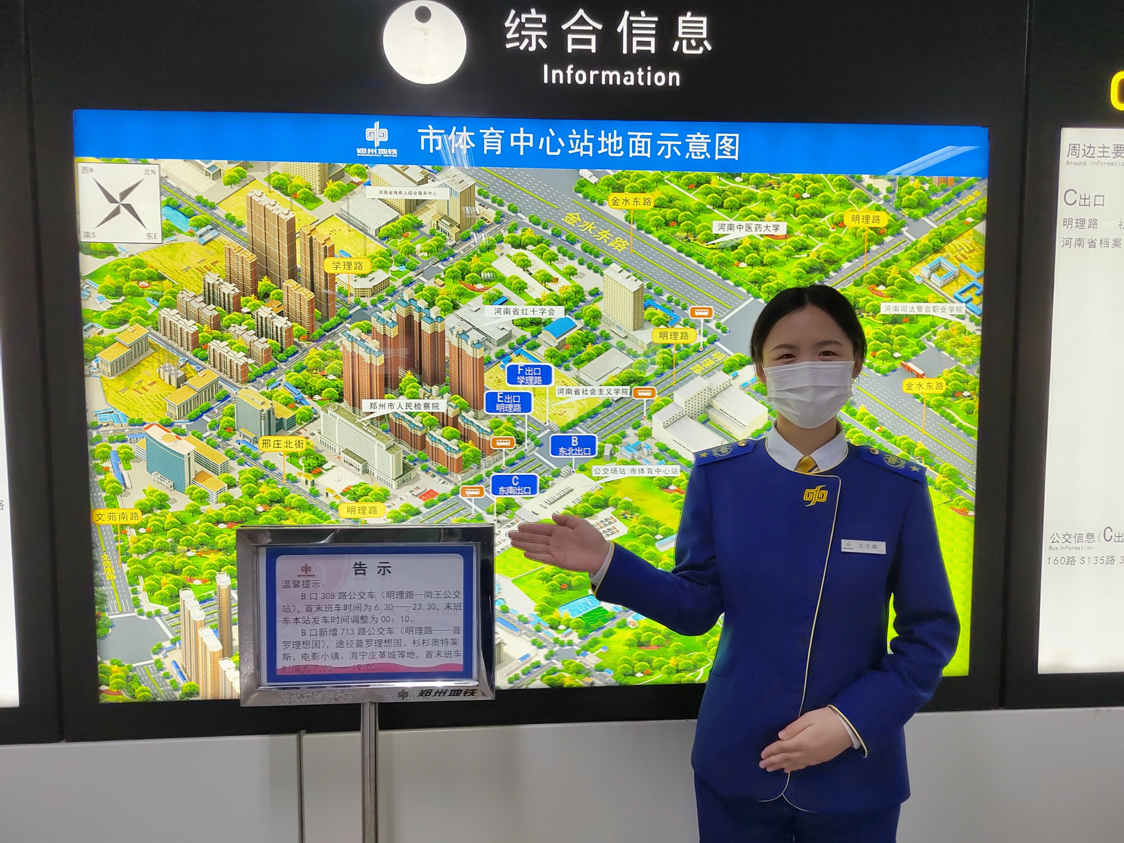 为给乘客提供精准换乘信息指引,节约换乘时间。市体育中心站及时制作新线路713路公交告示及贴纸,对途径商场、景区、社区内容、首末班车时间进行公示,对地铁车站站内导向标识进行优化提升,实现“地铁到站,公交信息一目了然”,强化了地铁站点与周边公交的接驳服务。 市体育中心站联合附近公交站点常态化开展进校园、进公交站场、进地铁车站、进社区志愿服务,宣传“地铁+公交”绿色出行理念及乘车技巧、安全知识等,设置爱心服务台为乘客提供拎包、针线缝合、热水等暖心服务,持续打造“有温度”的便民服务,让市民乘客感受到乘坐公共交通出行的美好体验。(供稿:贾义林、潘明欣)
