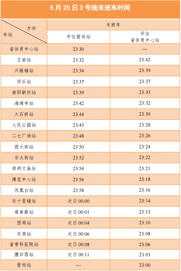 5月25日,3号线开往营岗方向末班车发车时间延长至23时30分。22时后,行车间隔8分钟。开往省体育中心方向末班车发车时间仍为23时。