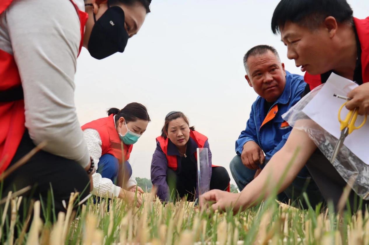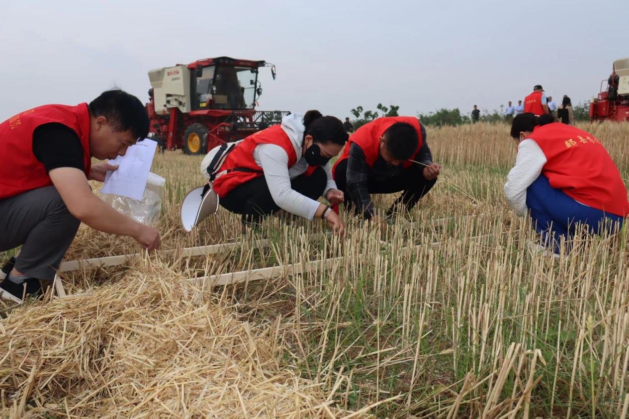 比赛不仅比速度,更比谁收麦子的损失率小。收割机走过,事先分成三组的郏县农机中心工作人员,即拿着剪刀、密封袋和长2.75米、宽0.5米的取样木框走到麦茬地选点取样:认真捡拾麦穗、麦粒。