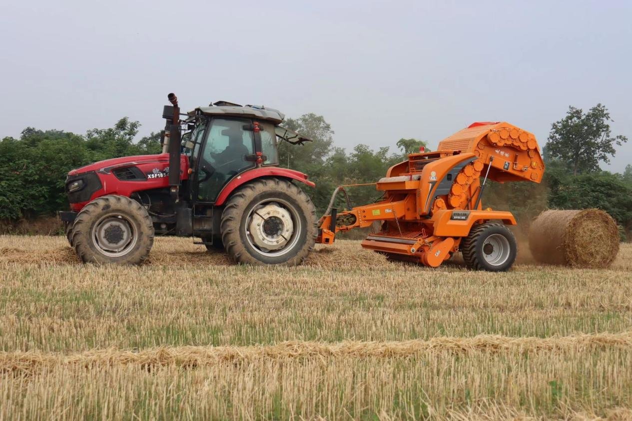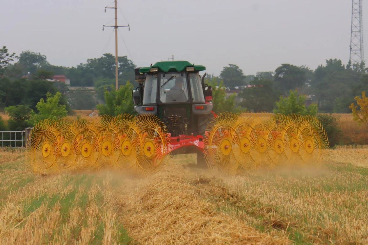 每台收割机取样点为两个。取样完毕,搂草机、打捆机即开始工作,搂草机作业面宽约8米,拖拉机驶过,麦秸被集中拢成一溜,紧随其后的打捆机完美收集。不到40分钟,4亩(1亩≈666.67平方米)地收获、秸秆离地完毕。