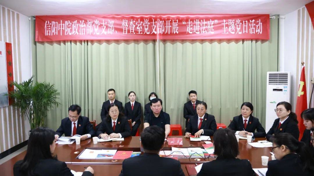 5月25日,信阳中院党组成员、政治部主任姚远带领政治部支部、督察室支部全体党员赴浉河区法院董家河人民法庭开展主题党日活动。浉河区法院党组书记、院长陈刚陪同参加活动。